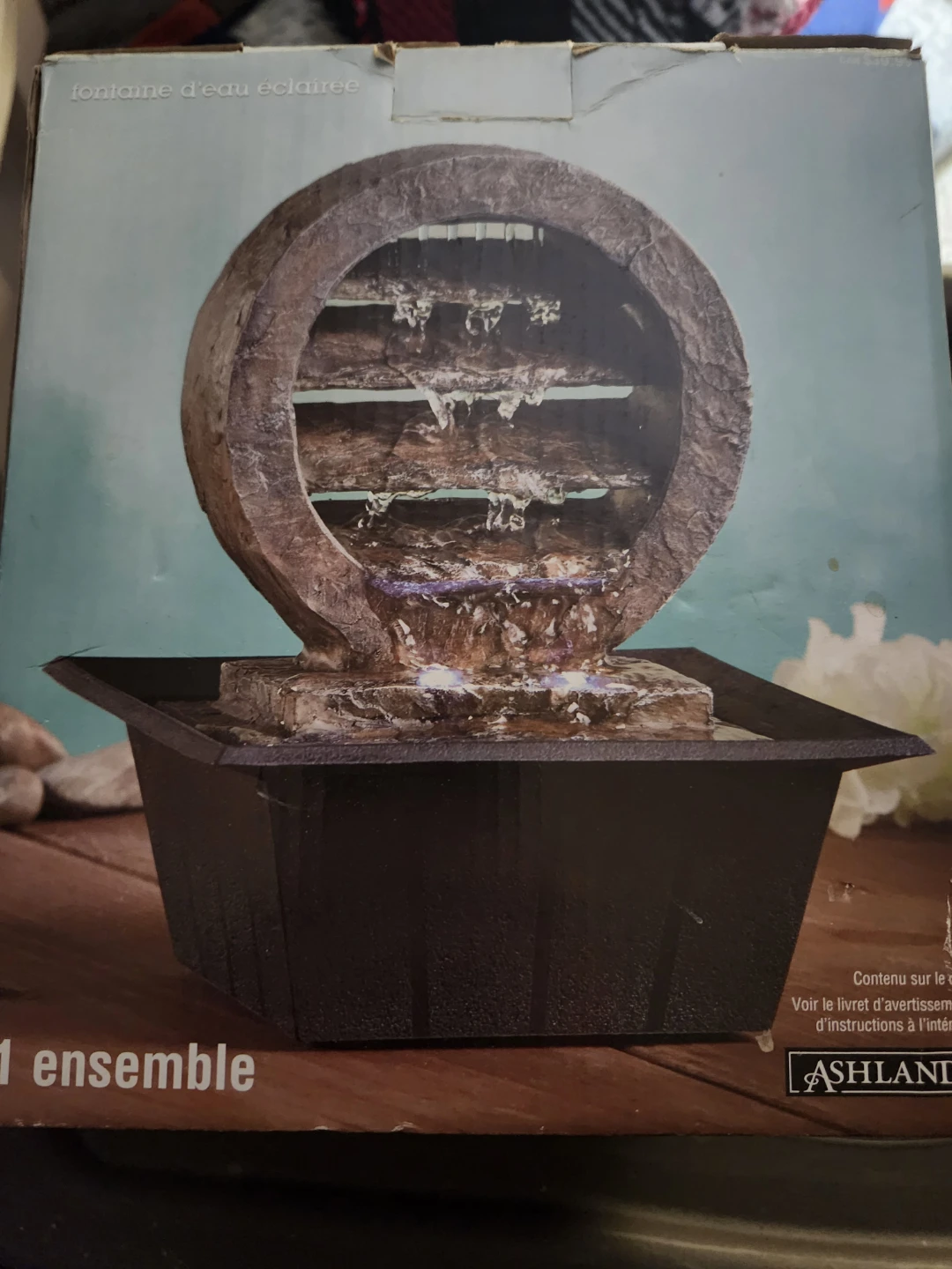 Selling an Ashland 'fontaine d'eau éclairée' (illuminated water fountain). It comes as a complete ensemble, with instructions included