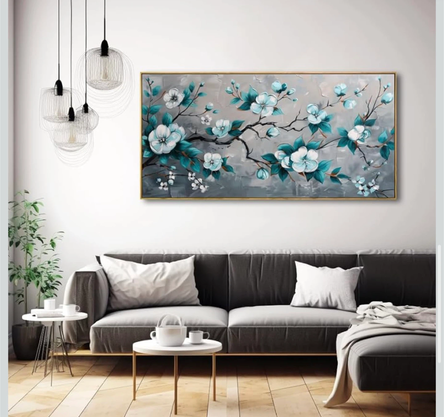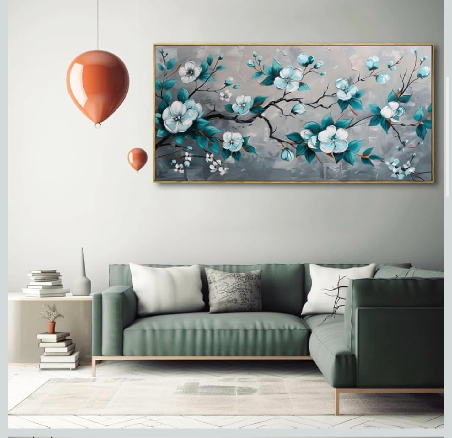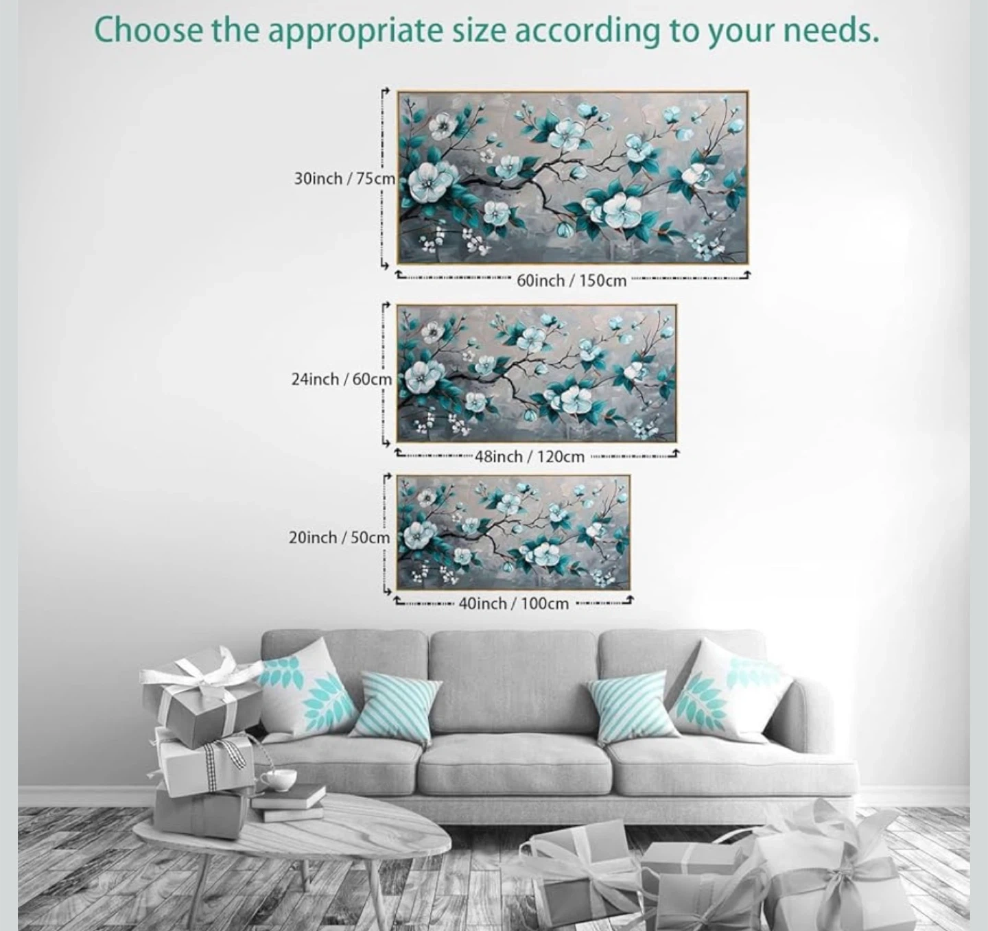 Adorn your living space with this brand new, sealed rustic flowers wall decor, sized at 60cm x 120cm, featuring an elegant floral design with teal leaves on a grey backdrop. It's a sophisticated and modern piece of art. Below are the specs: