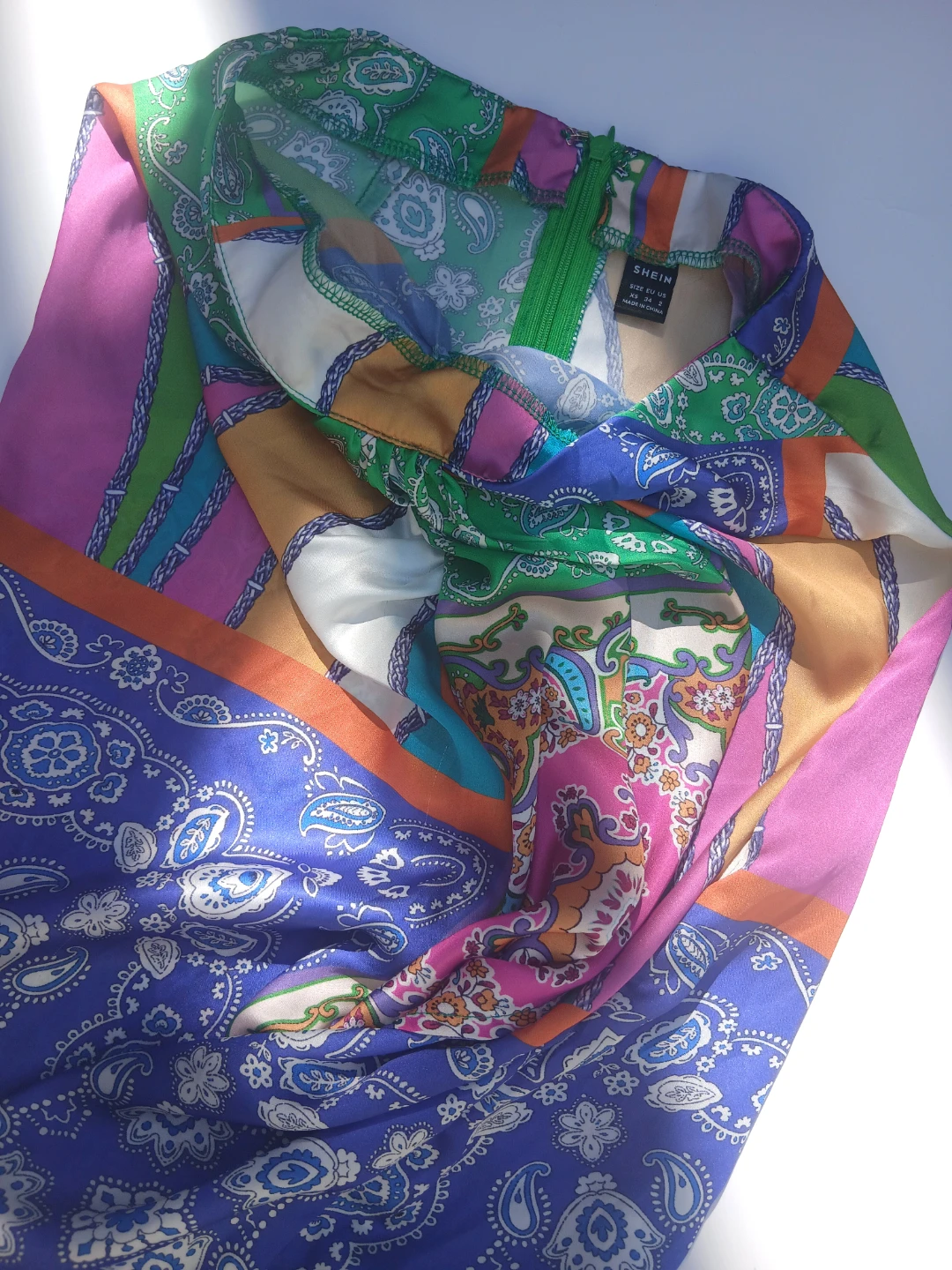This is a Shein patchwork print skirt with a knot detail and a slit. It features a colourful design with a mix of patterns and vibrant colours. Perfect for adding a unique touch to your wardrobe!