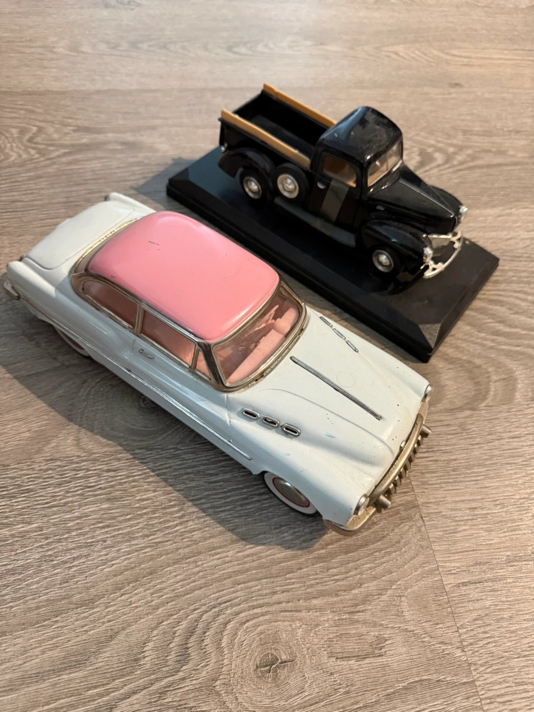 As is two vintage car models! One is a black 1940 Ford Pickup and the other is a white car with a pink roof. Both are in good condition and would make a great addition to any collection