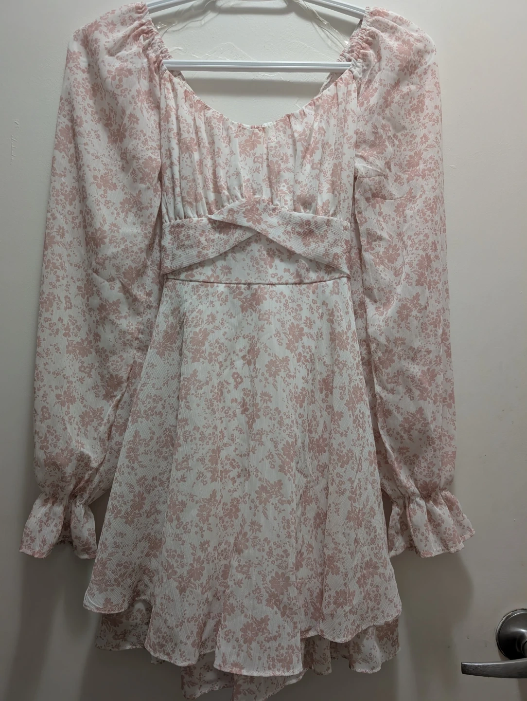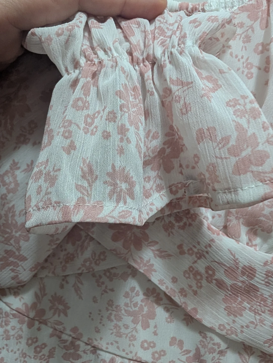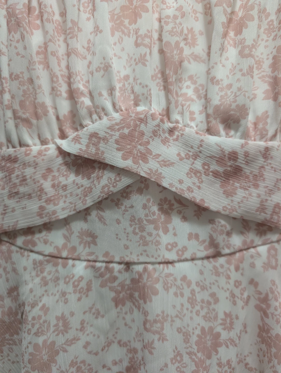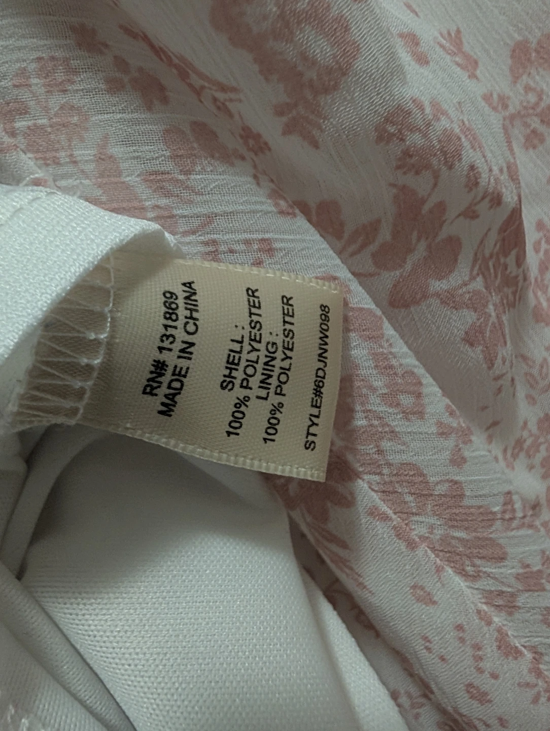 This is a cute floral print mini dress. It's made of 100% polyester for both the shell and the lining. The style number is 6DJNW098. Perfect for a summer day!
