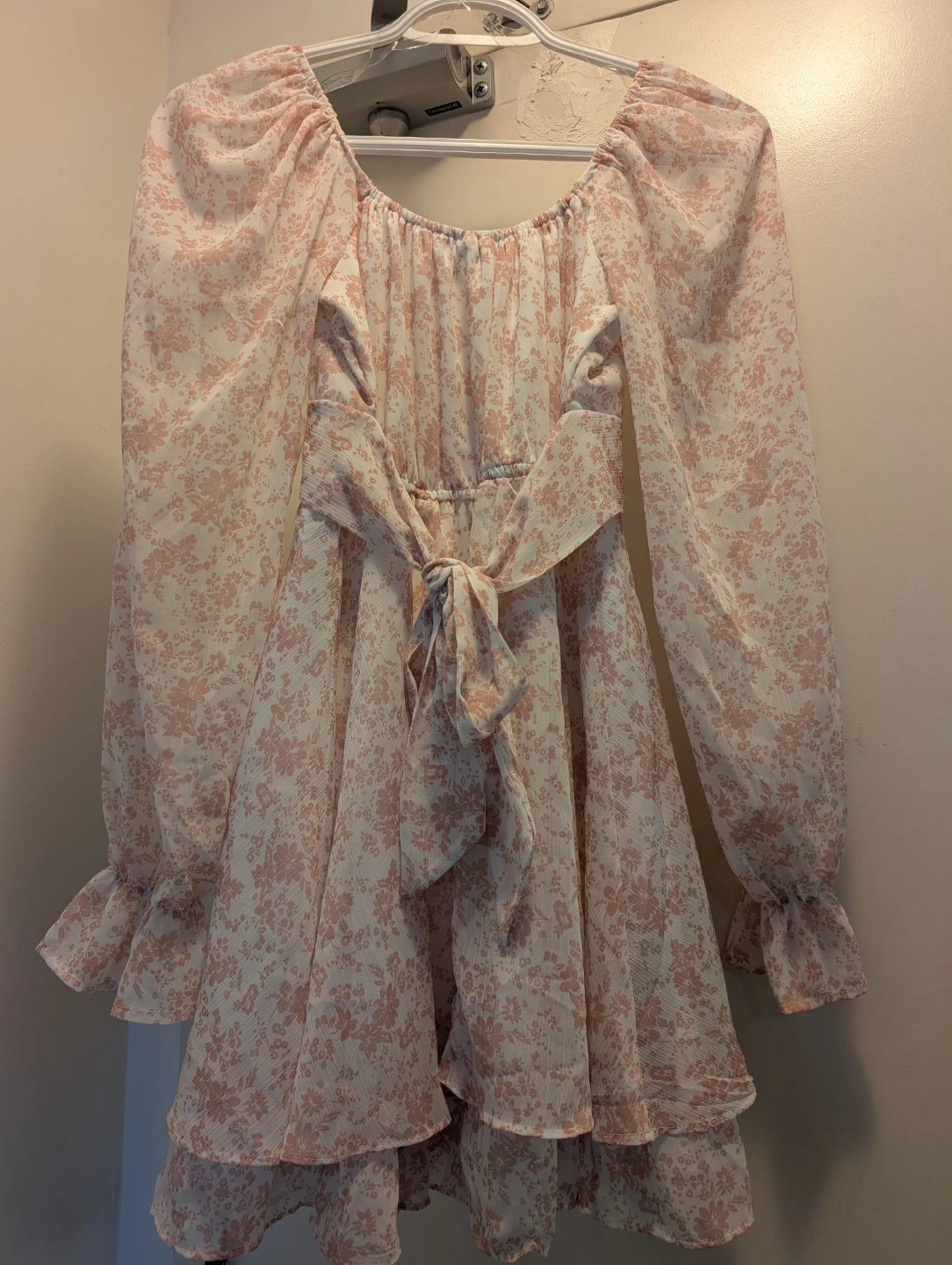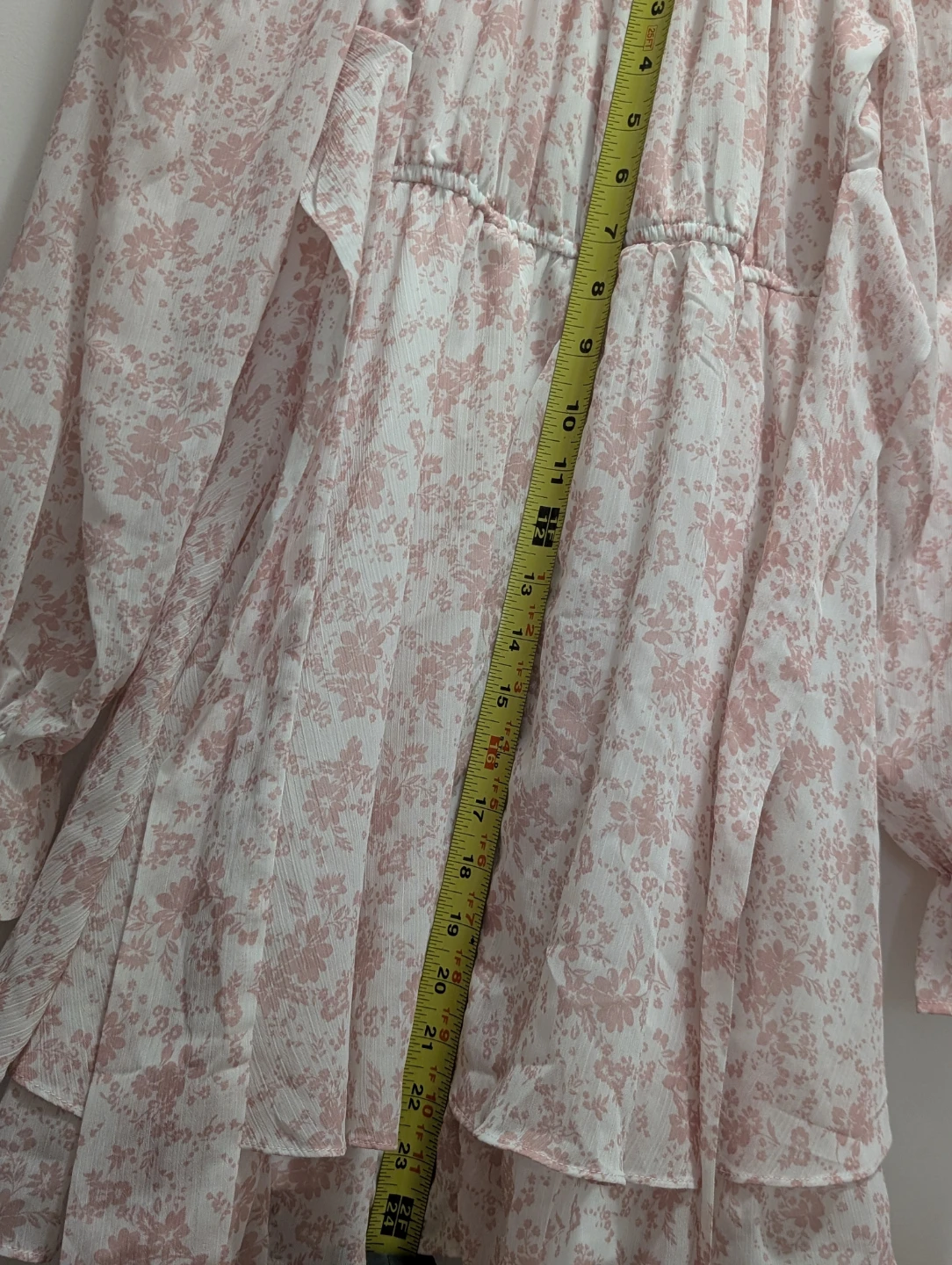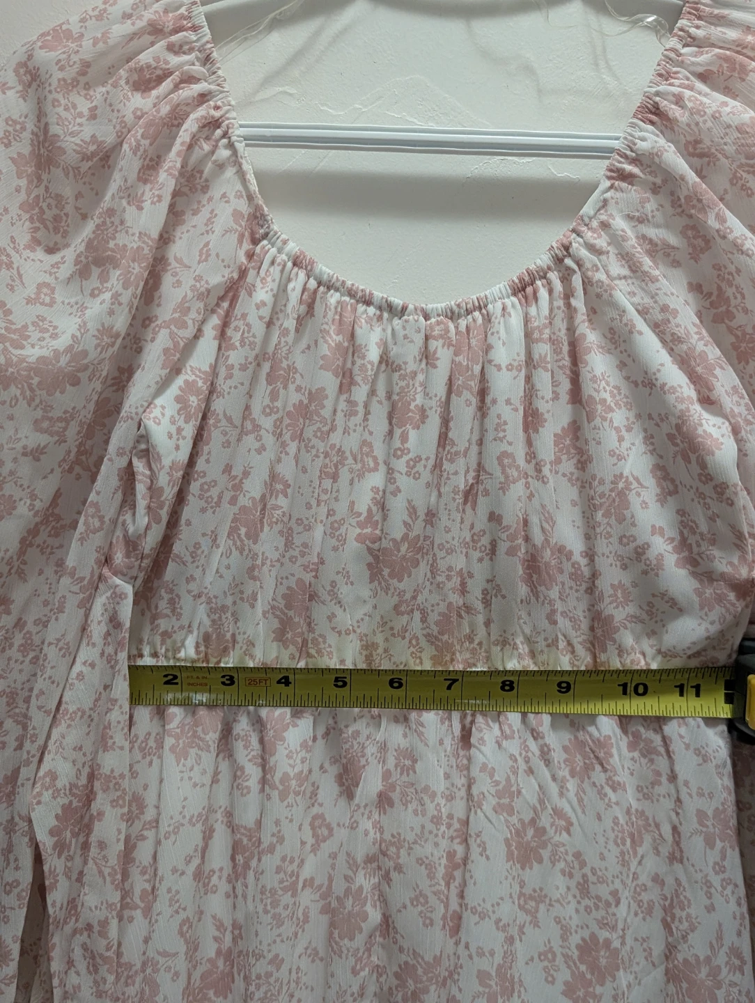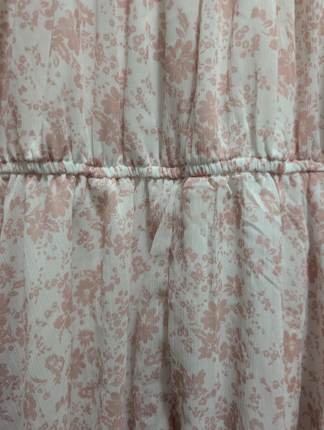 This is a cute floral print mini dress. It's made of 100% polyester for both the shell and the lining. The style number is 6DJNW098. Perfect for a summer day!