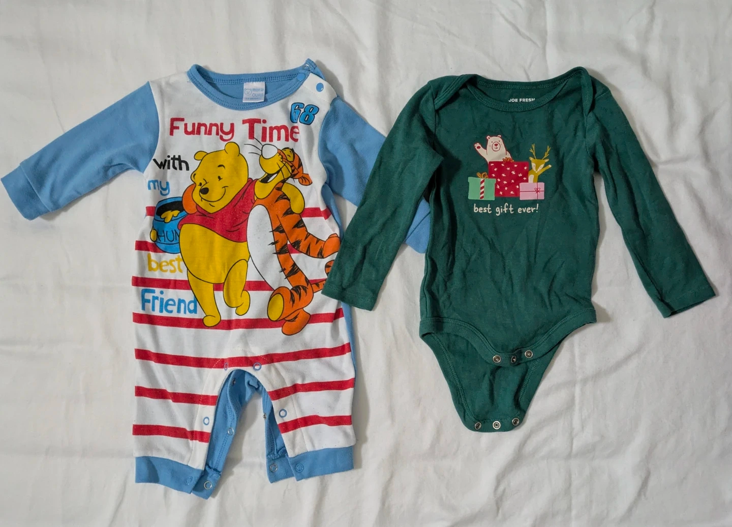 Two adorable baby onesies for your little one! One features Winnie the Pooh and Tigger with the words 'Funny Time with my best Friend'. Good condition. The other is a Joe Fresh onesie with a cute bear and presents design and says 'best gift ever!' - like new, only wore once.