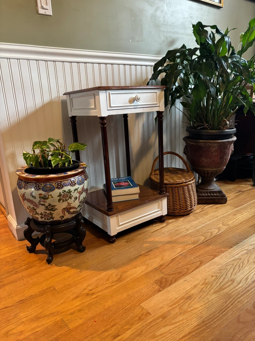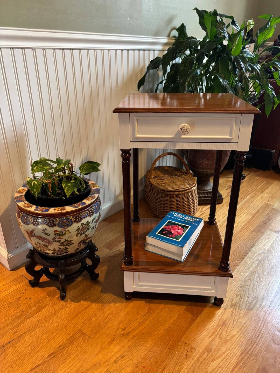 This is a charming side table, perfect for adding a touch of elegance to any room! It features a handy drawer, ideal for storing small items and keeping your space tidy. The combination of brown and white gives it a classic look that complements a variety of decor styles. Custom Furniture by Suzi. Cash & carry. Pick up in Lindenhurst, NY.