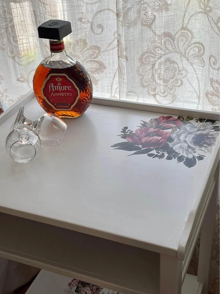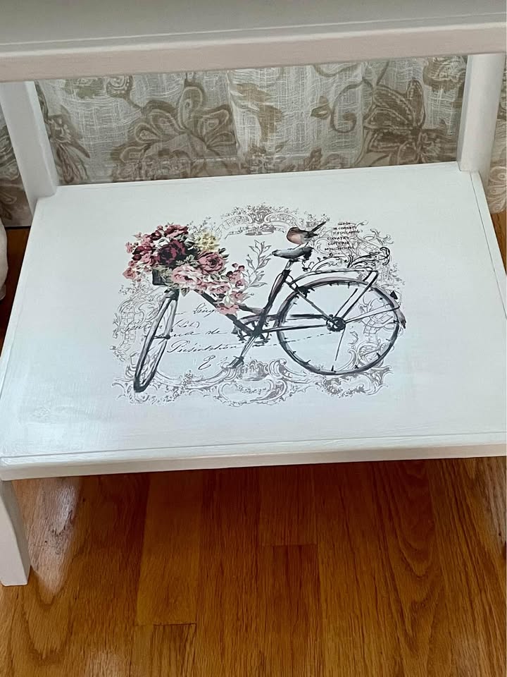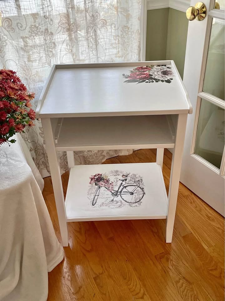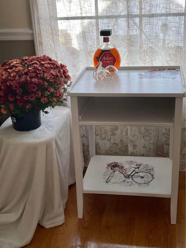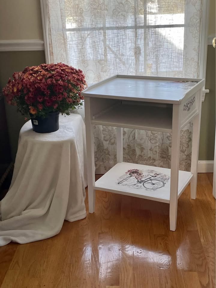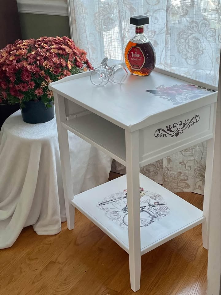 Linen white accent table embellished with Prima bike rides and floral transfers. Solid wood end table is versatile, can be used as night stand in bedroom, an accent piece in your dining room or a statement piece for your living room. Chalk painted with linen finish then top coat sealed. Table measures 21β L x 17β D x 28β H.