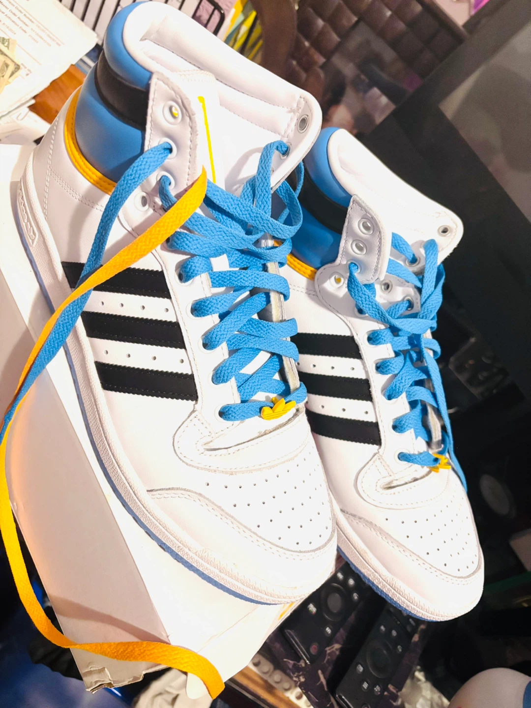 Selling a pair of Adidas Top Ten RB shoes in white with blue and black accents! These stylish high-tops are in great condition and ready for a new home. They feature the classic Adidas three-stripe design and a comfortable fit. Perfect for adding a retro touch to your wardrobe!