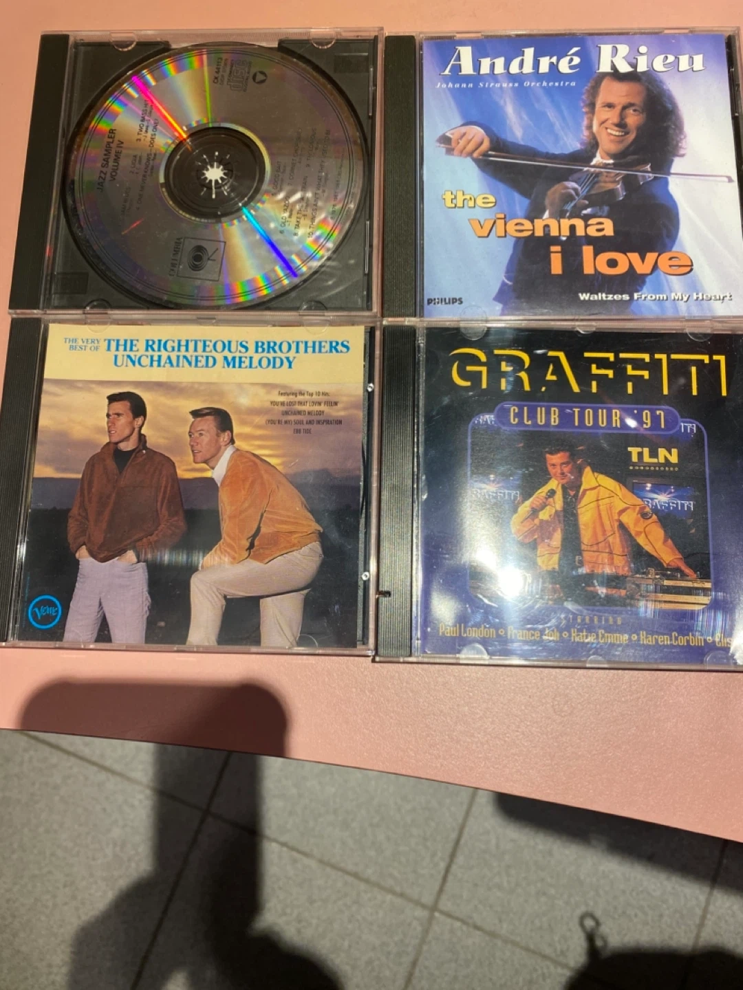 Selling a collection of CDs including Jazz Sampler Volume Four, Andre Rieu, The Righteous Brothers, and Graffiti Club Tour '91. Great for music lovers!