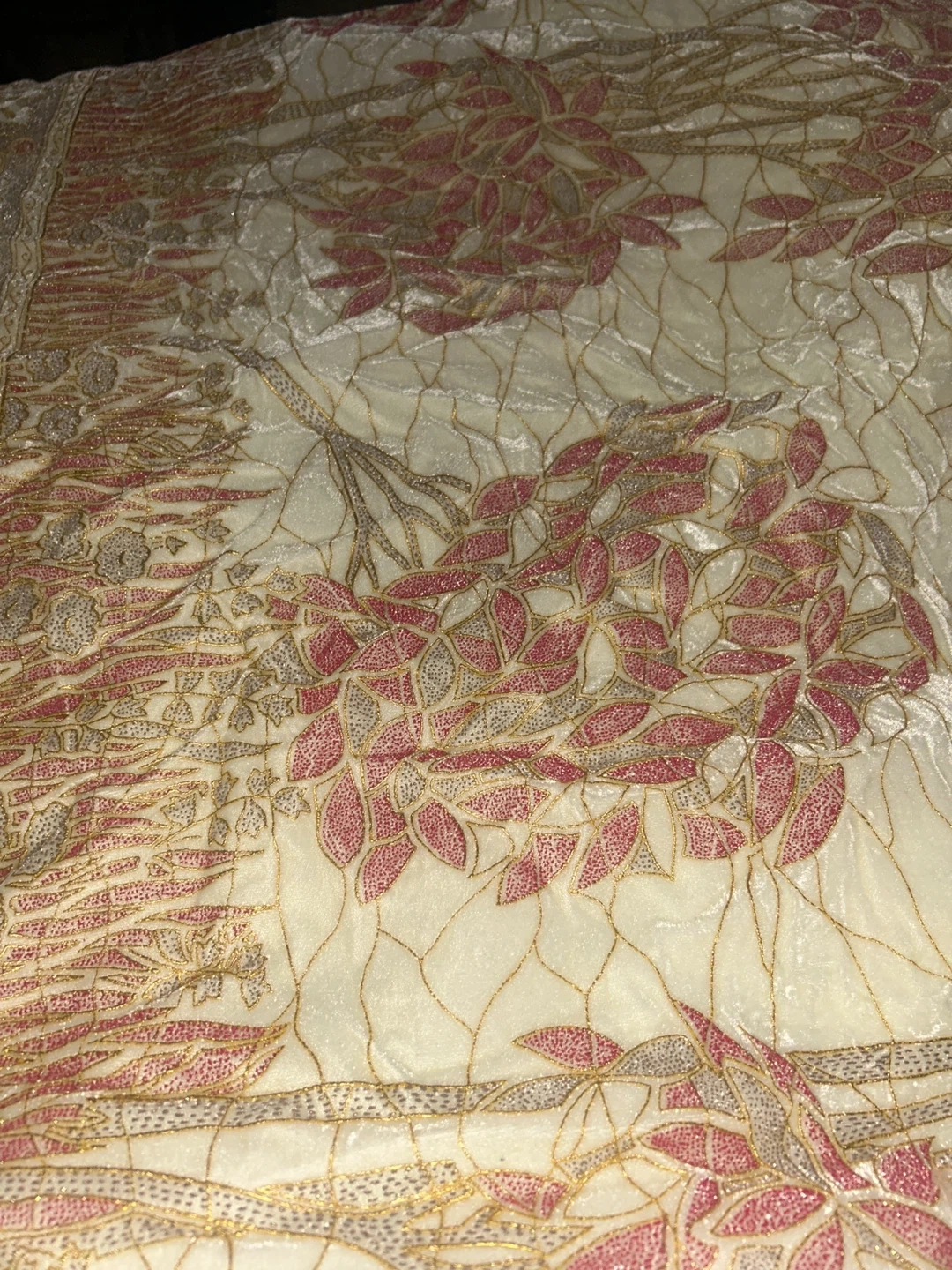 Fabric with a pretty pattern. It has a soft texture velvet and would look great draped over a couch, chair or you can sew something with it.