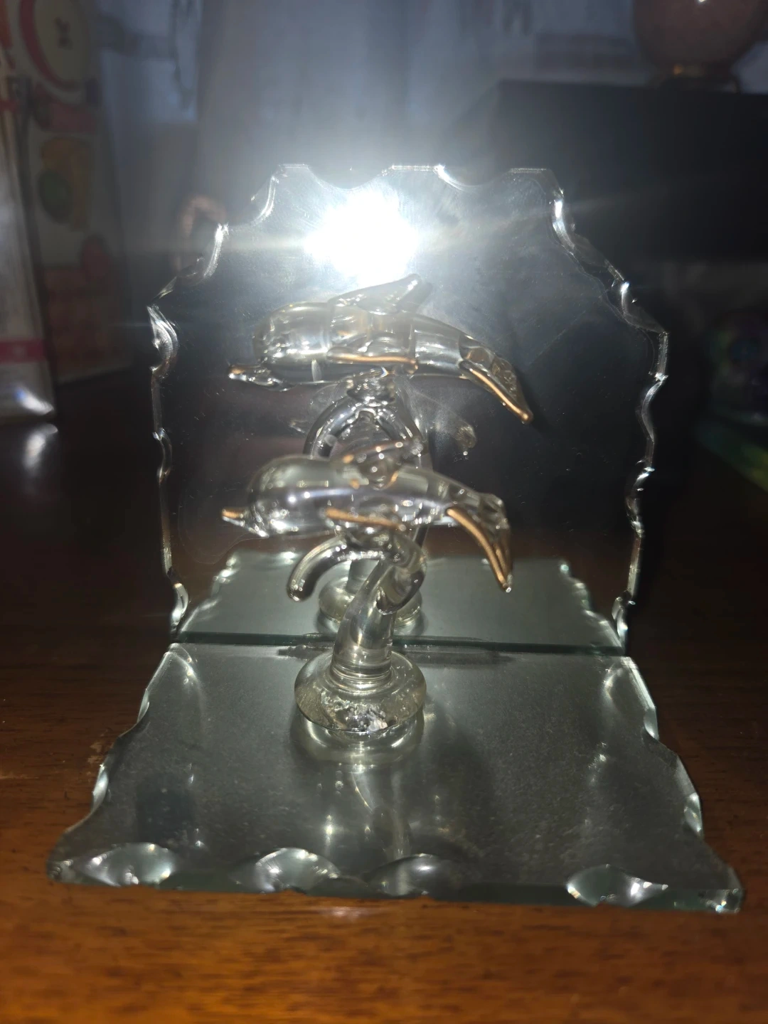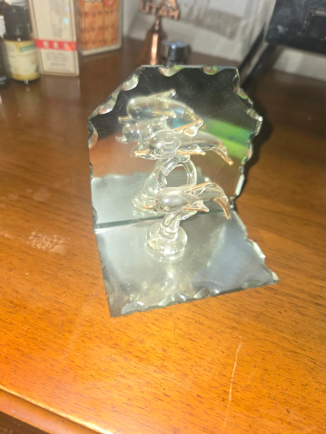 A charming glass dolphin ornament featuring three dolphins stacked on a clear stand, set against a mirror base. This unique piece would make a lovely addition to any collection or as a decorative accent in your home