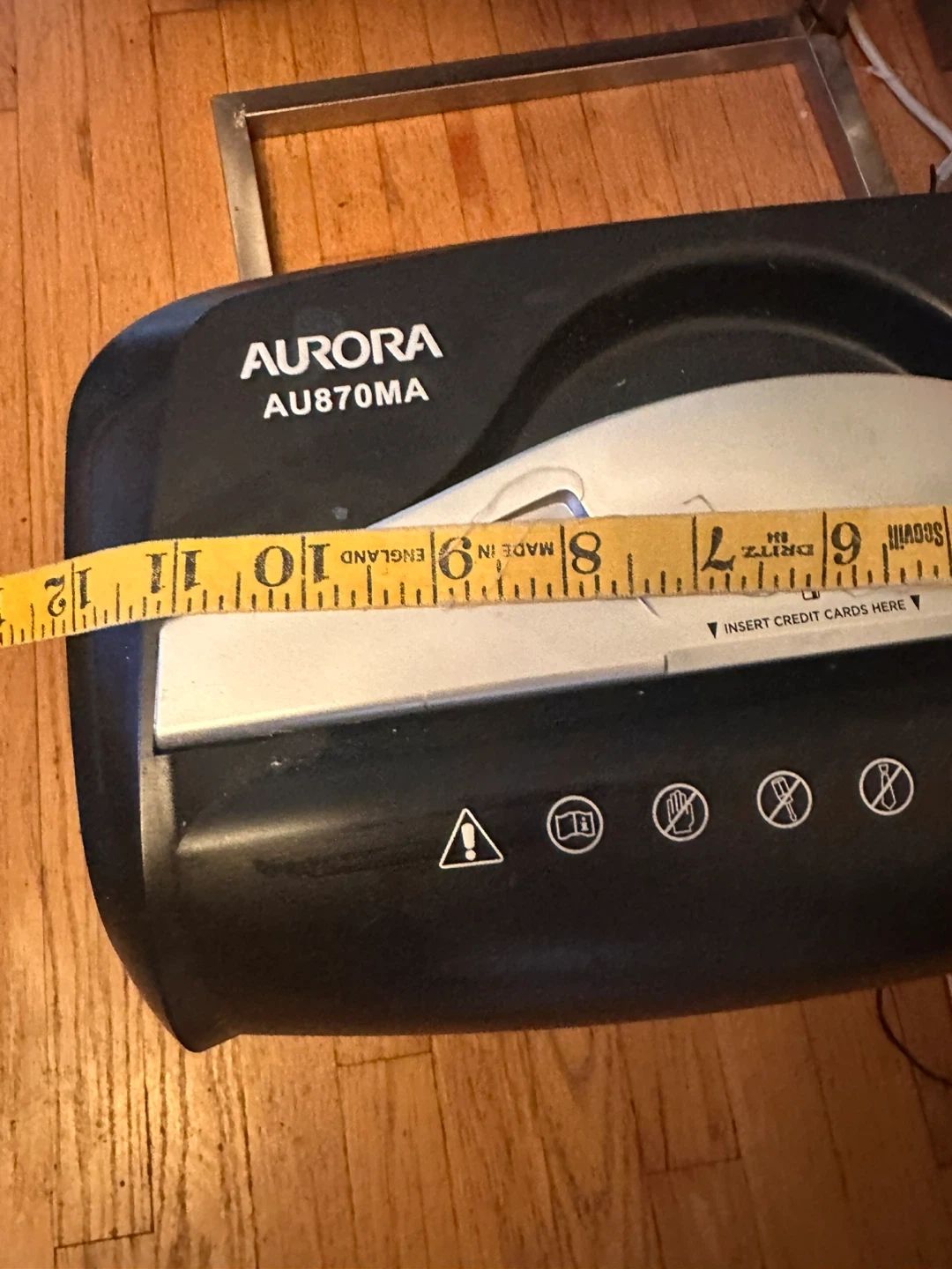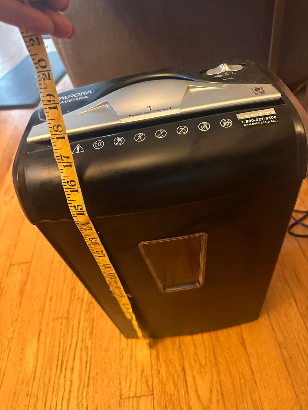 Selling an Aurora AU870MA paper shredder. It's black and in good condition. The shredder appears to be around 16 inches tall and 12 inches wide. Great for home or office use! Works great