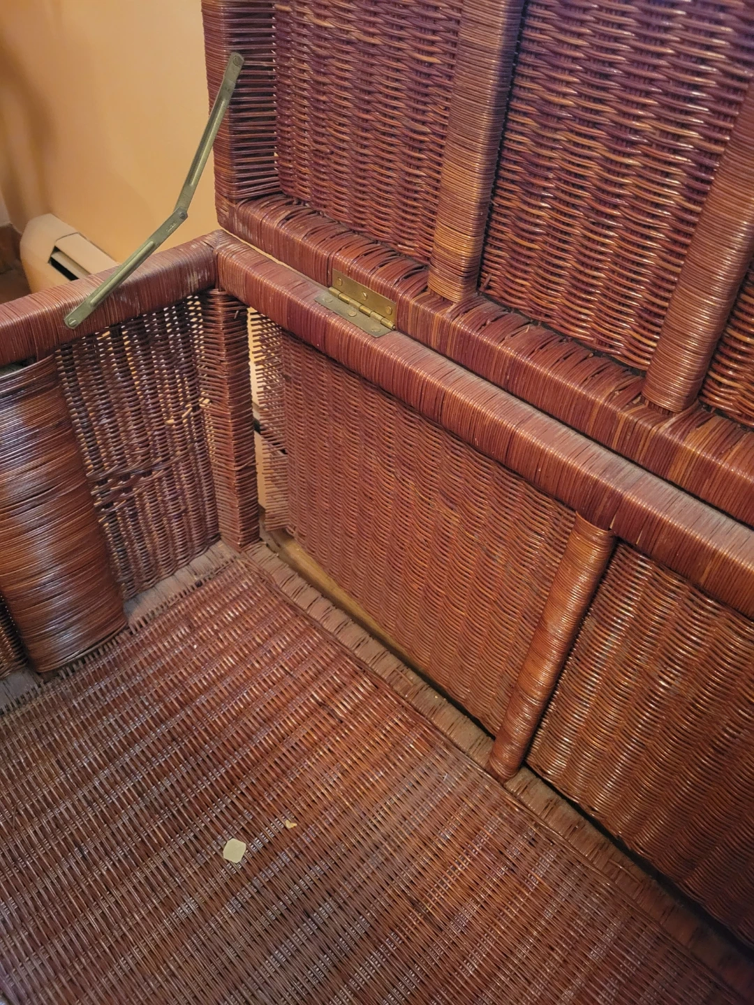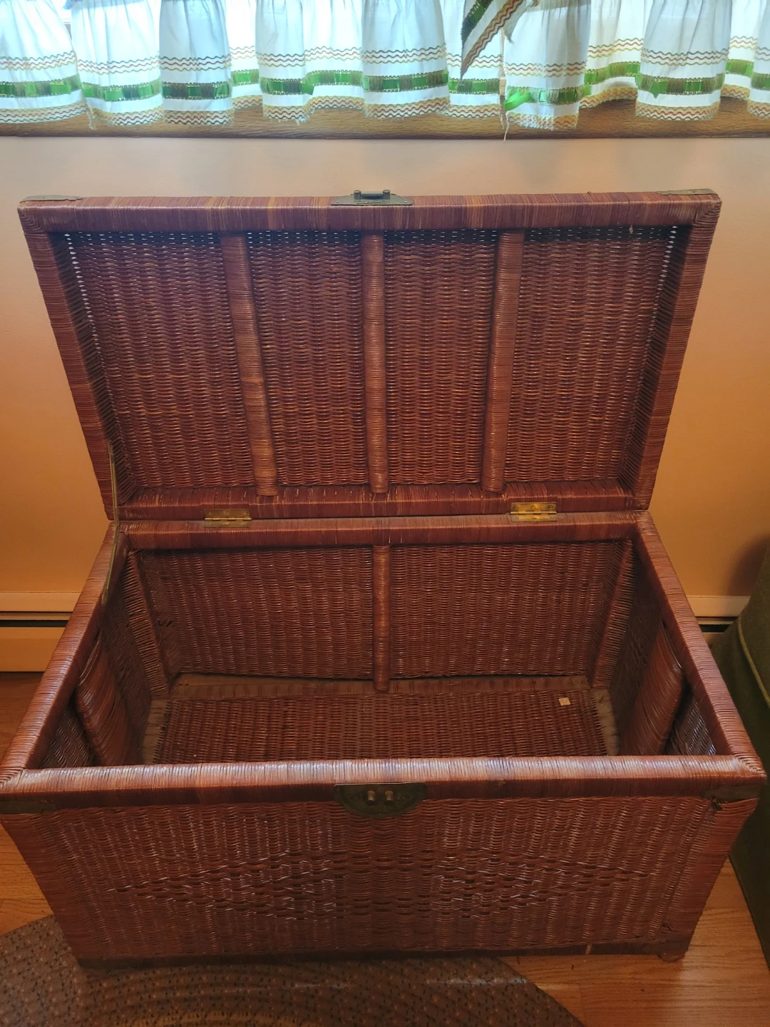 Selling a wicker storage trunk. It's in good condition and perfect for storing blankets, toys, or anything else you need to keep out of sight! It has a rustic look, with a latch to keep it closed.