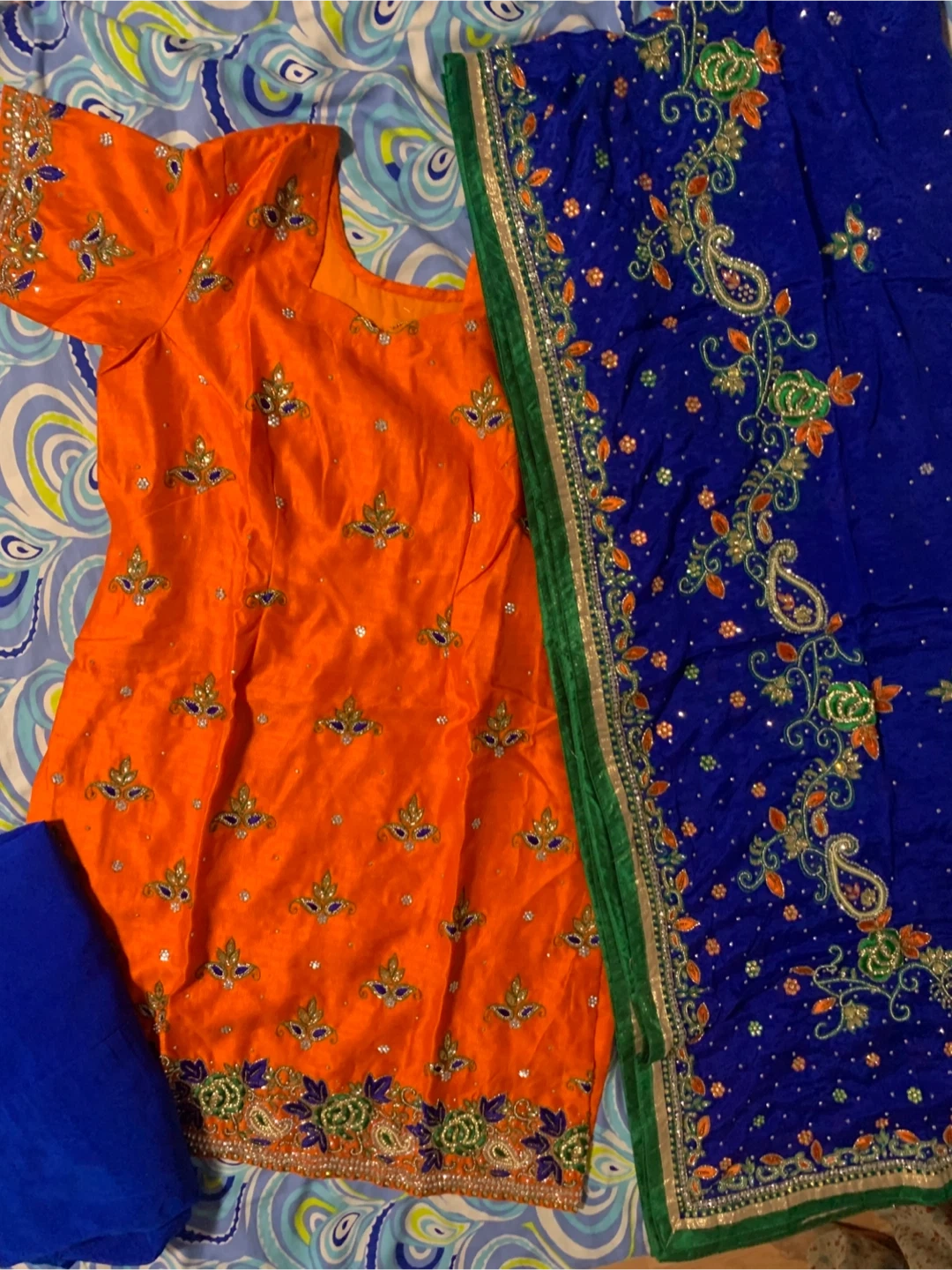Beautiful salwar kameez set featuring an orange top with intricate embroidery and a contrasting blue dupatta. The set includes a matching bottom. Perfect for festive occasions or cultural events!