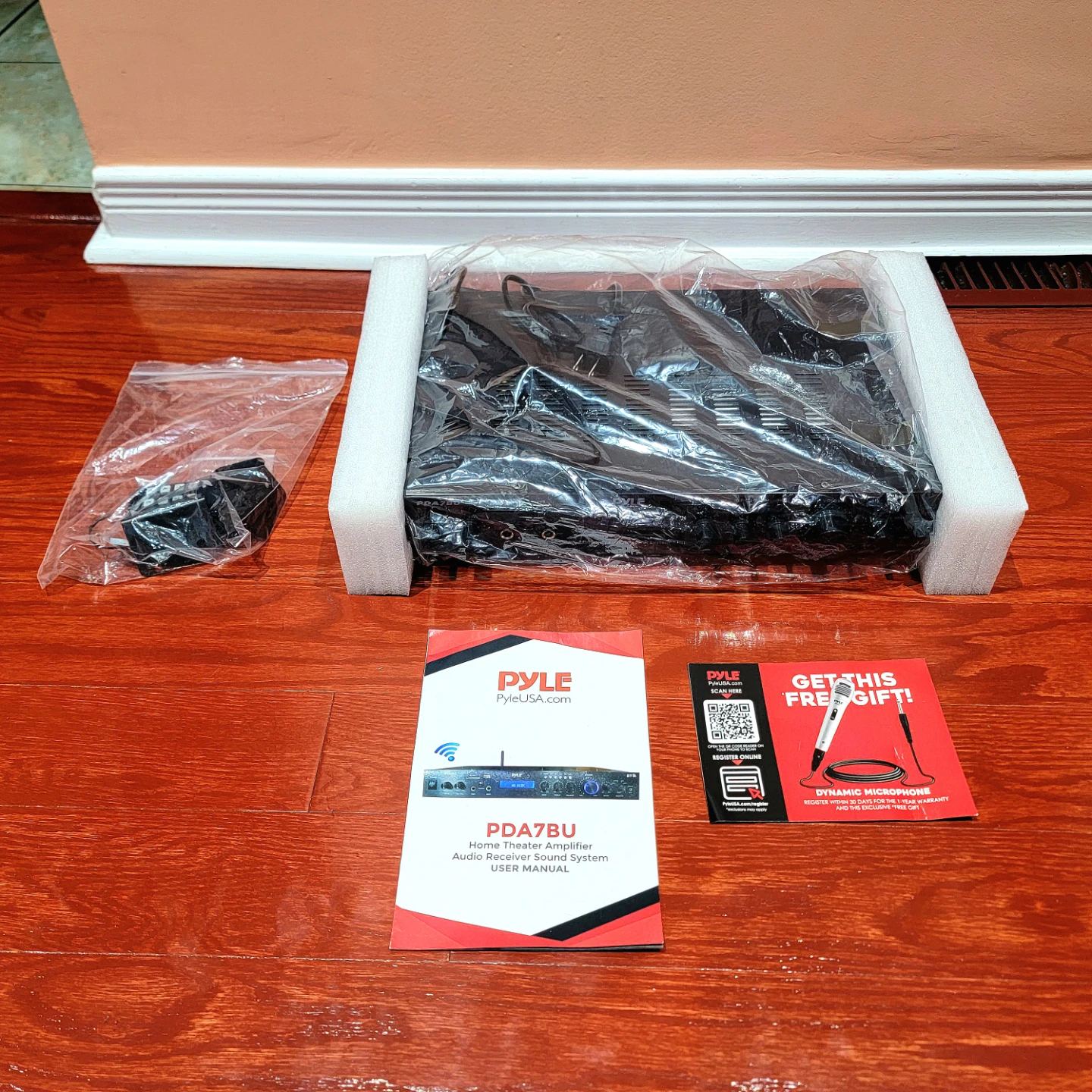 1 Pyle Amplifier (built in antenna and power cord), 1 remote, 2 rack mounts, 1 FM antenna wire, 1 bag of mounting screws, 1 User Manual.