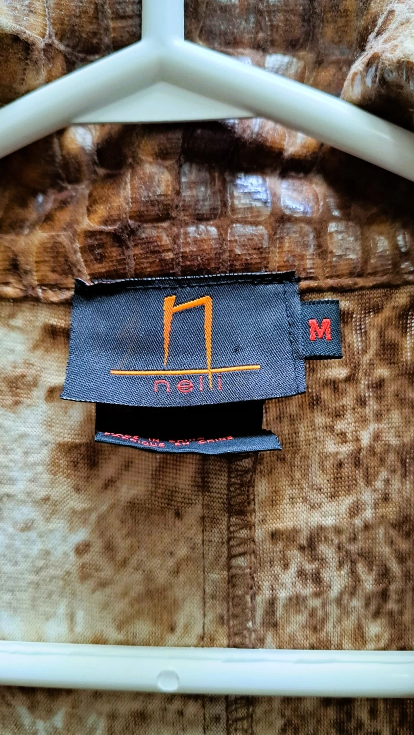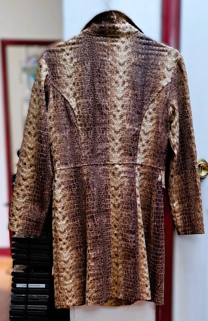 This lovely long blazer or short coat in a beautiful rich brown and tan colour with lapels and a collar has two large front buttons for closure and front flap pockets. It is a vintage piece from the 1990s. The texture is an all-over embossed crocodile print, faux leather, or a treated material made to look like genuine crocodile skin leather. Its timeless design and statement texture make it a standout piece in any wardrobe. In excellent condition. Well kept and cared for beautifully.
