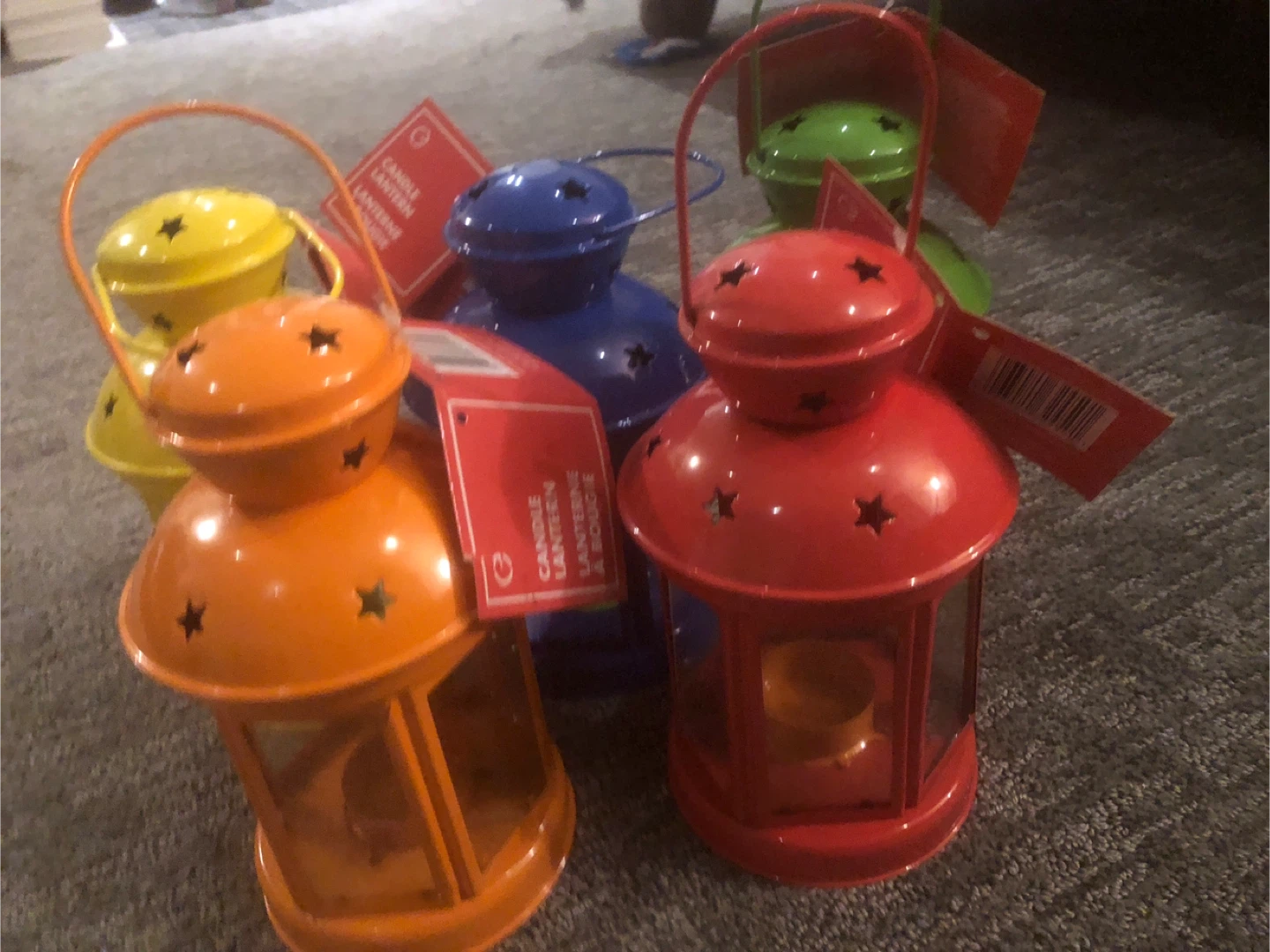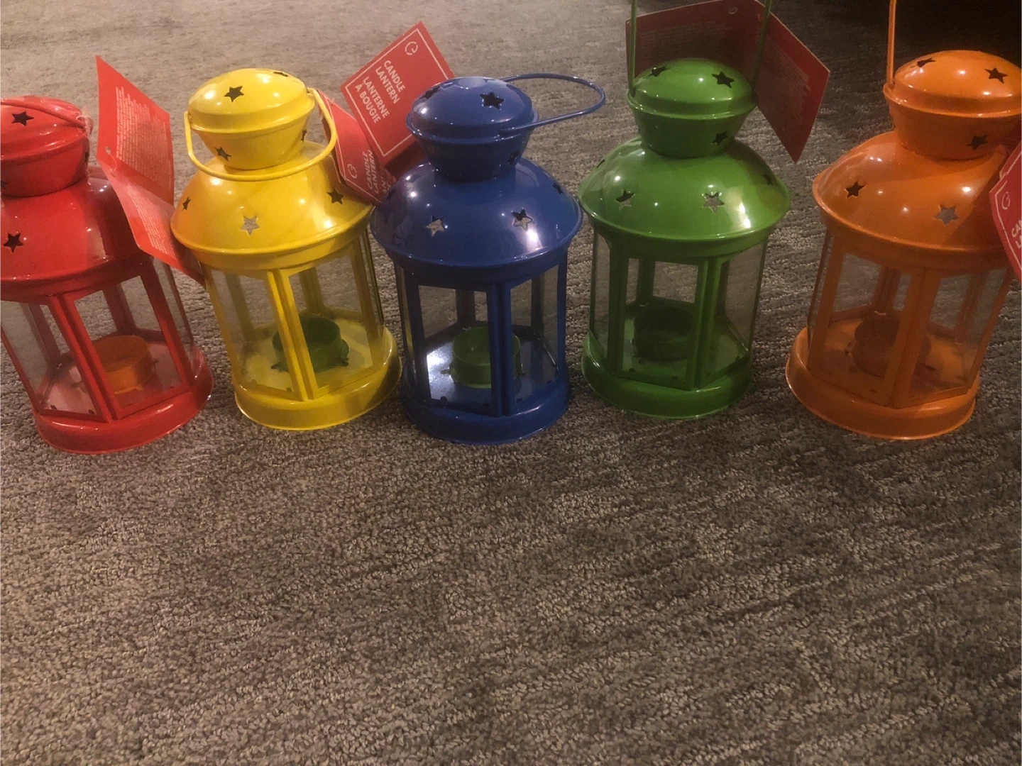 Selling a set of five colourful candle lanterns! These are perfect for adding a cozy touch to any room or outdoor space. The set includes red, yellow, blue, green, and orange lanterns, all in great condition