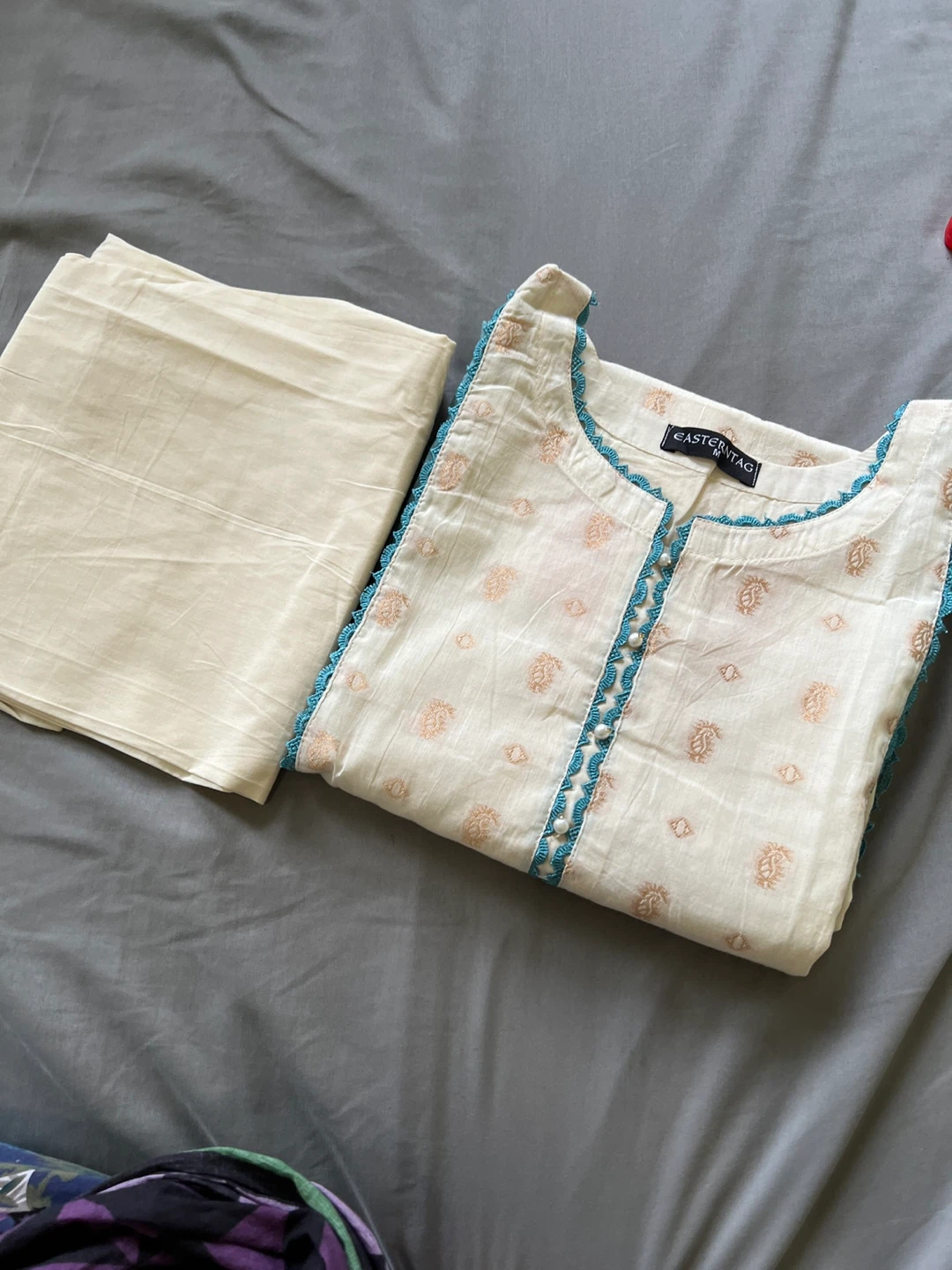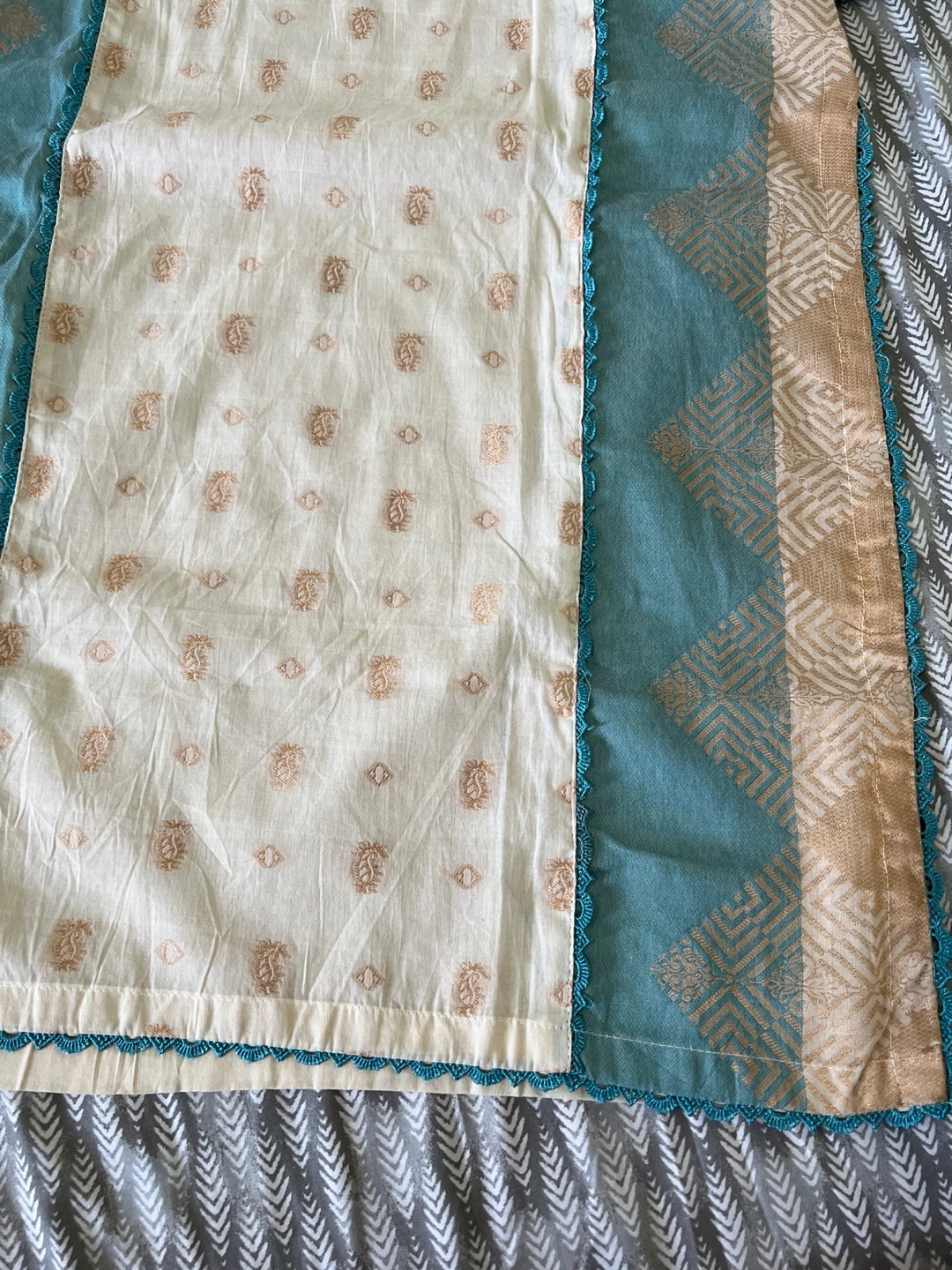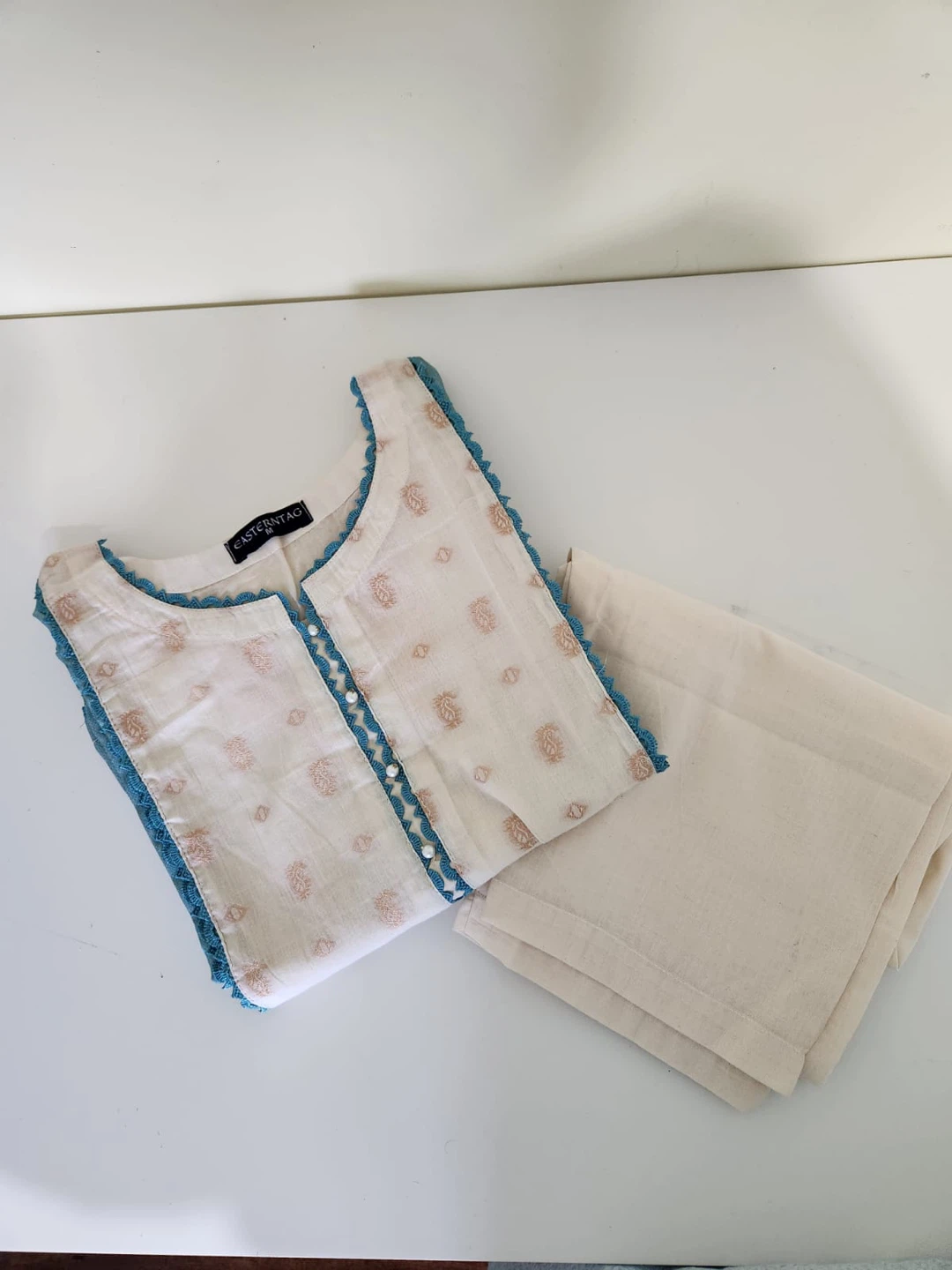 Selling 2 Pcs beautiful Pakistani Jacquard Suit. The colours are a beautiful mix of cream, teal, and peach, making it a unique piece for your wardrobe. Its brand New