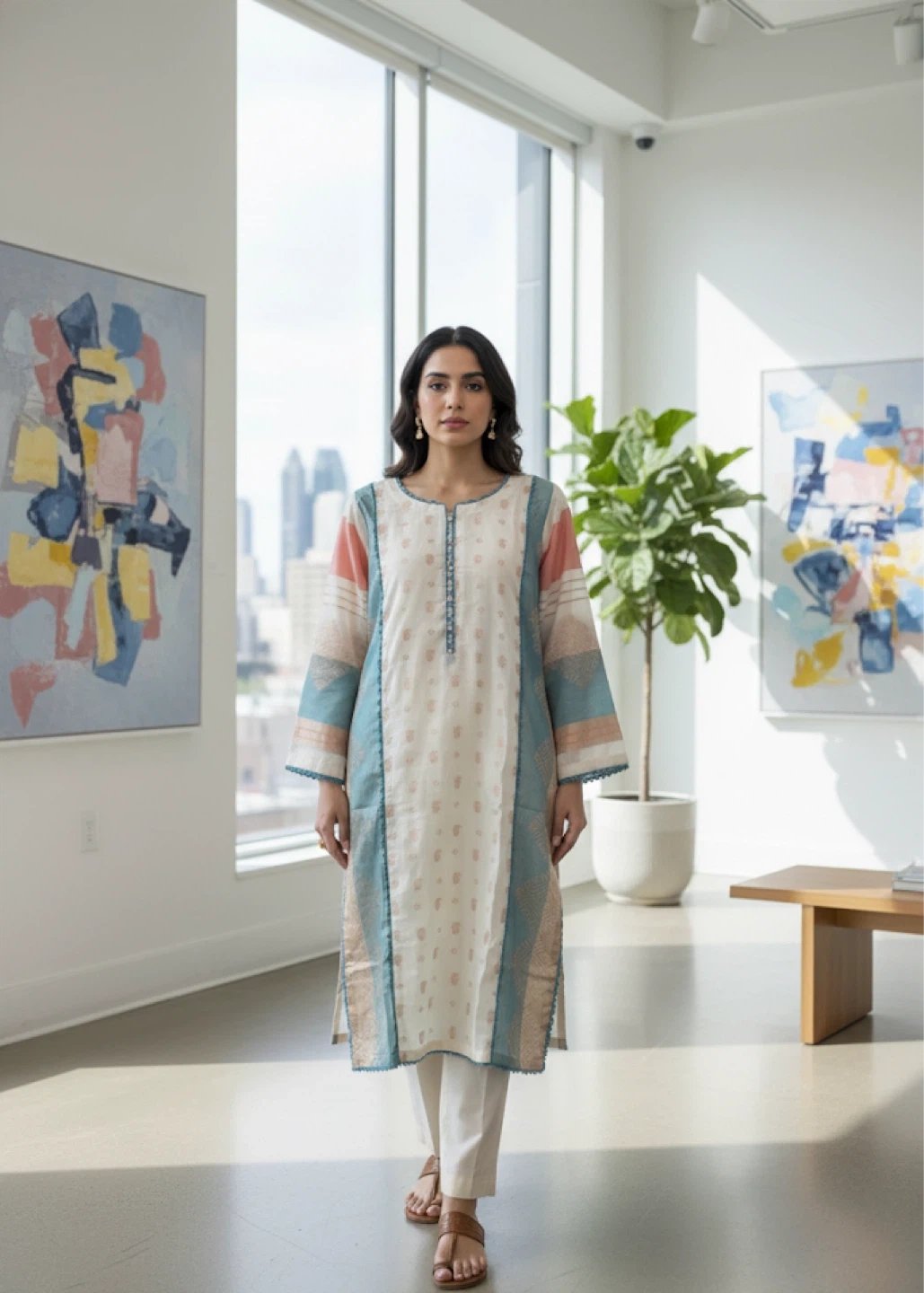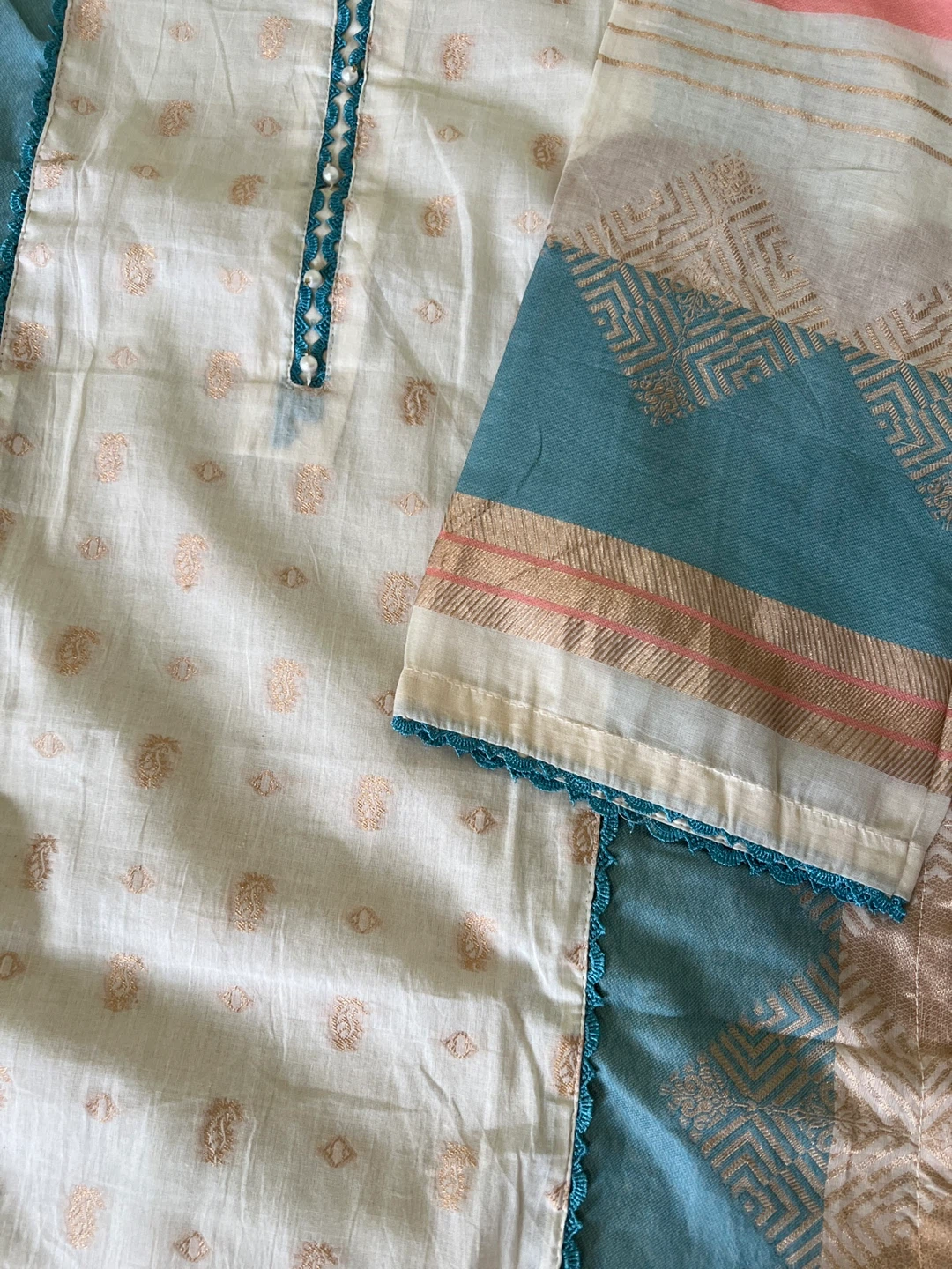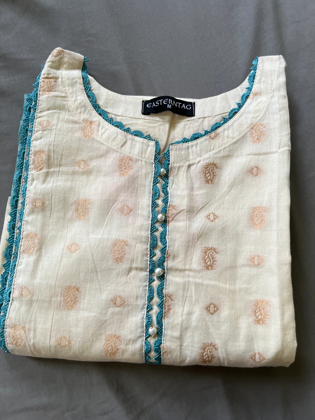 Selling 2 Pcs beautiful Pakistani Jacquard Suit. The colours are a beautiful mix of cream, teal, and peach, making it a unique piece for your wardrobe. Its brand New