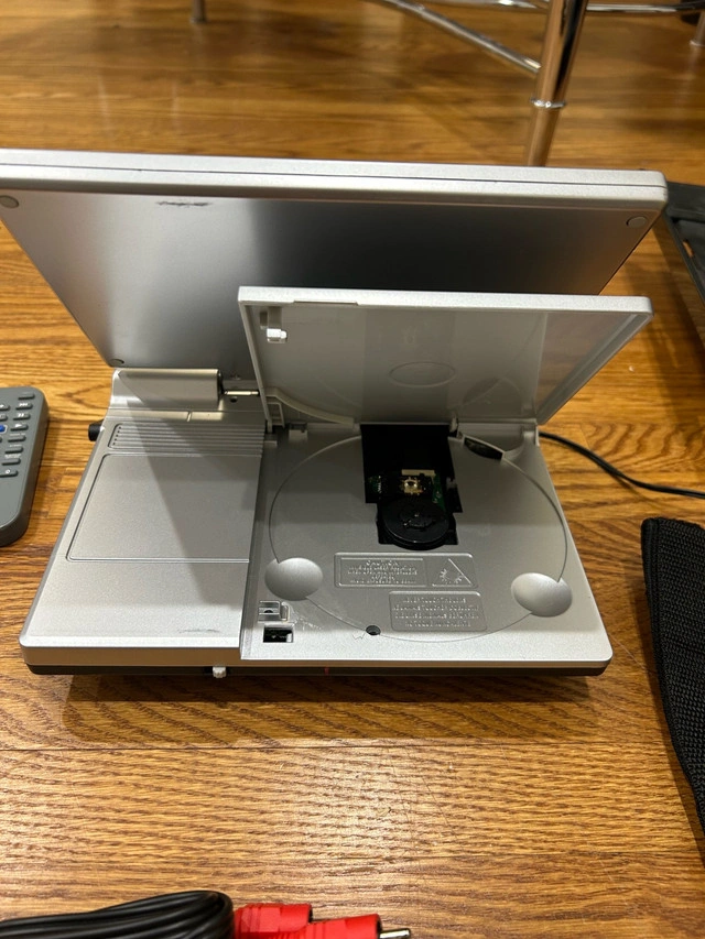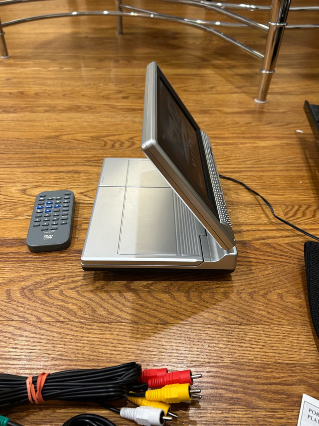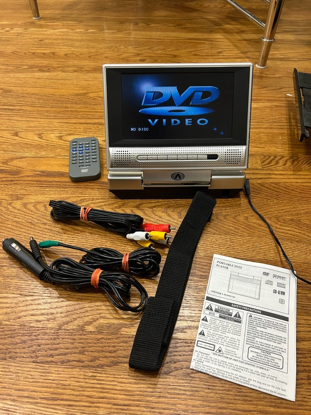 Watch your favourite movies on the go with this portable DVD player, featuring a built-in screen and included remote. This is a used item, but it is still fully functional. Comes with a car adaptor and headrest strap.