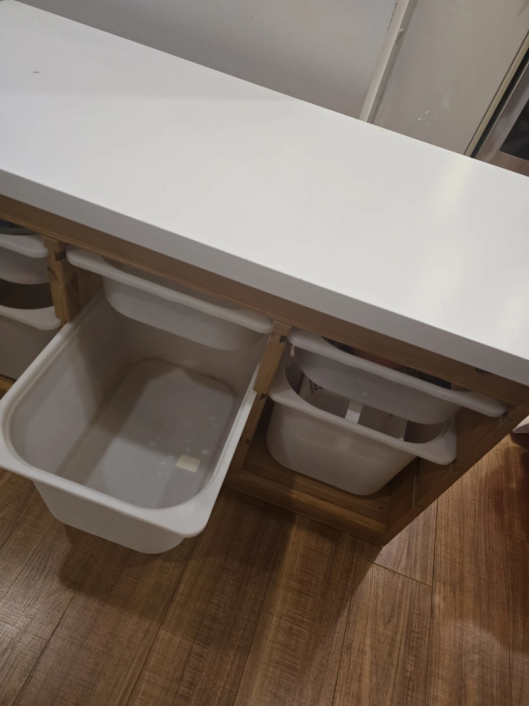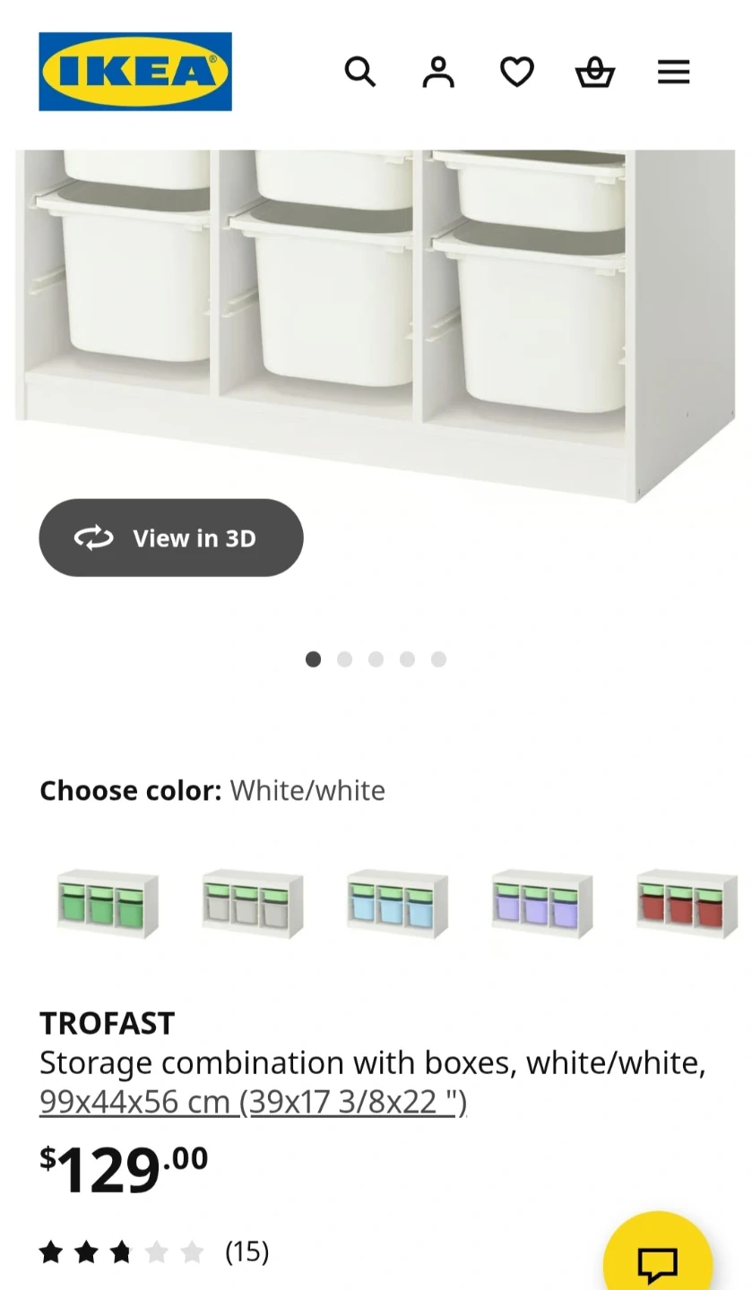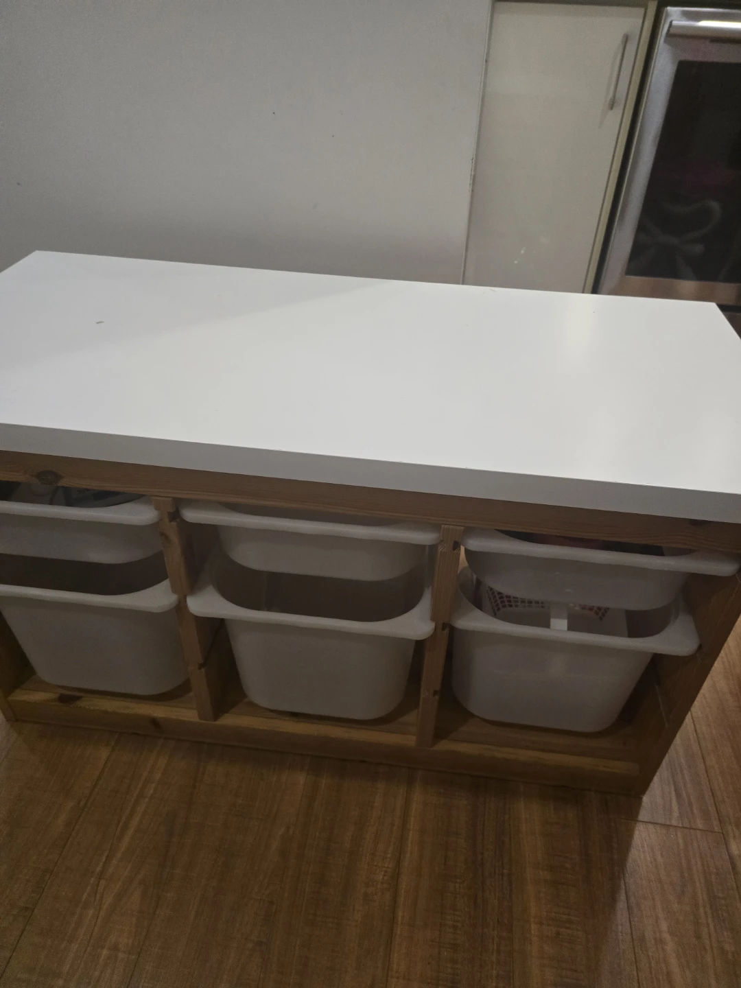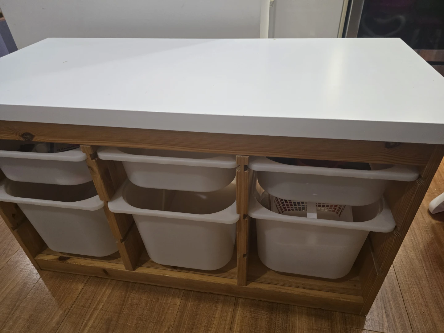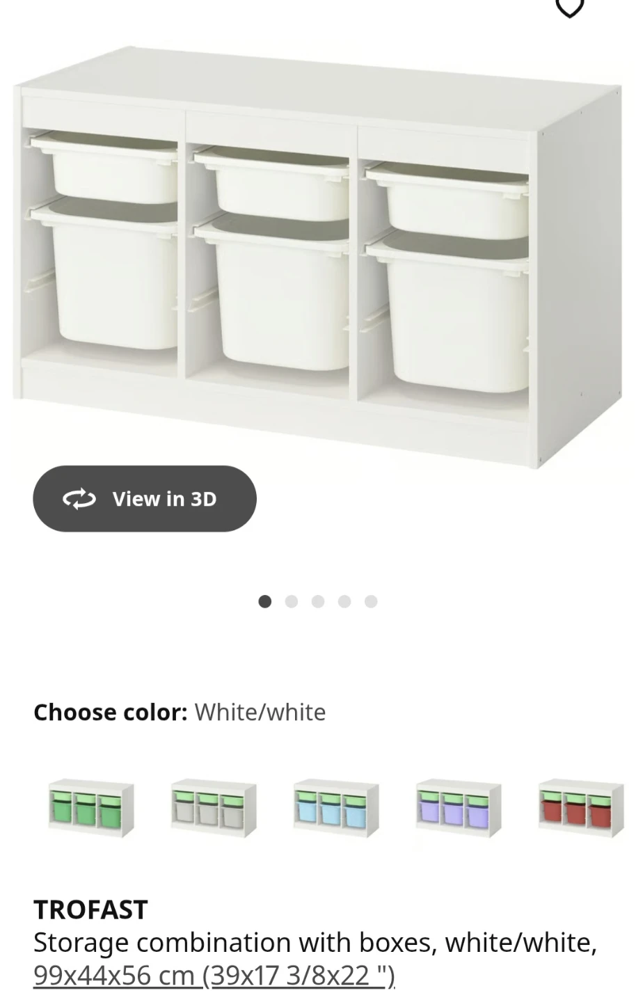 Selling an IKEA TROFAST storage combination with boxes in white/white! It measures 99x44x56 cm (39x17 3/8x22 "). Great for organizing toys or other items in a kids' room or playroom