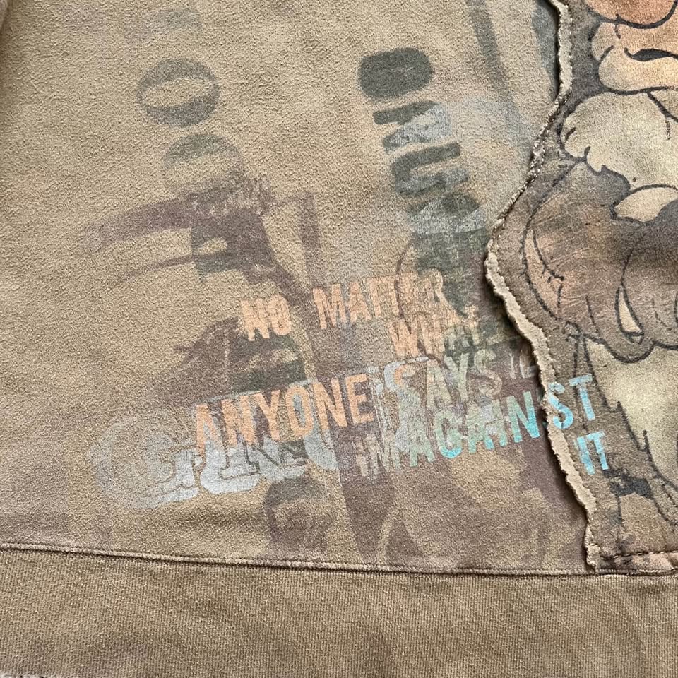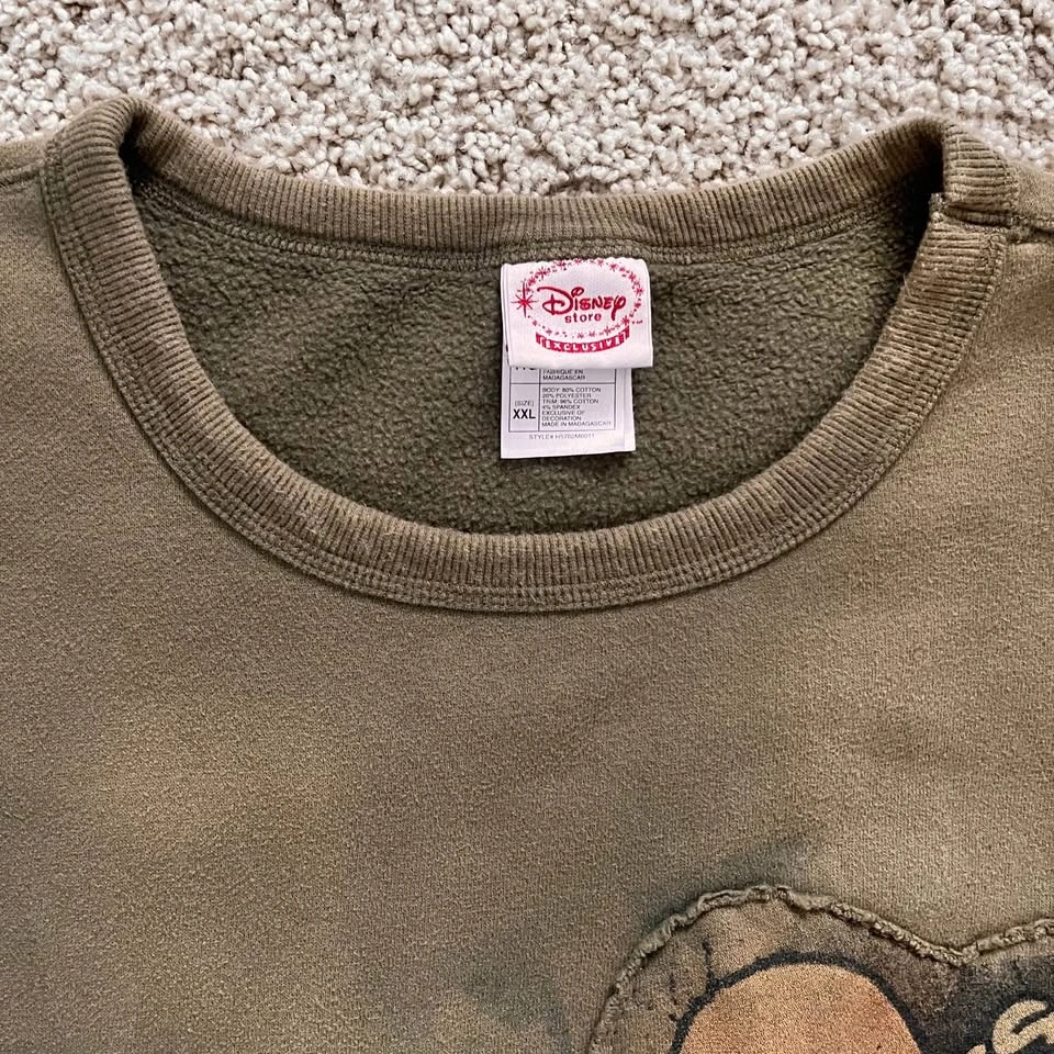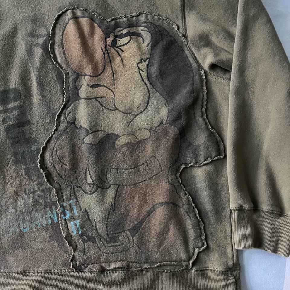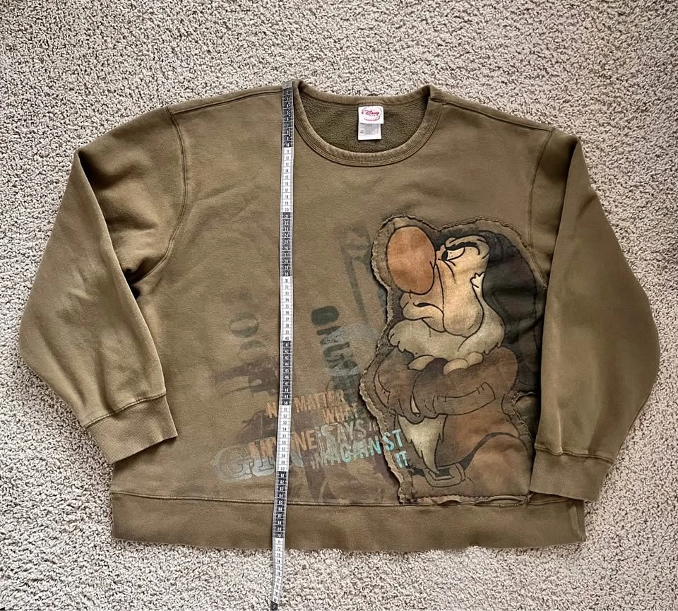 Classic Disney Snow White and The Seven Dwarfs sweatshirt. "No Matter What" written with a large Grumpy cutout stitched on the front. One-of-a-kind sweatshirt with a lived-in, classic crewneck feel. Warm and cozy, and the perfect oversized fit! Good pre-loved condition with slight wash wear and a spot on the sleeve as shown in the photos. The colour is difficult to describe, I would say it's an earthy brownish green.