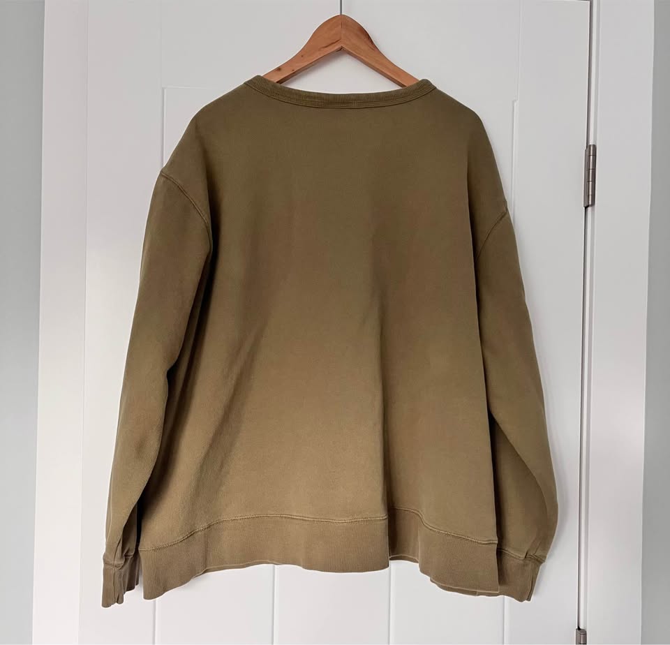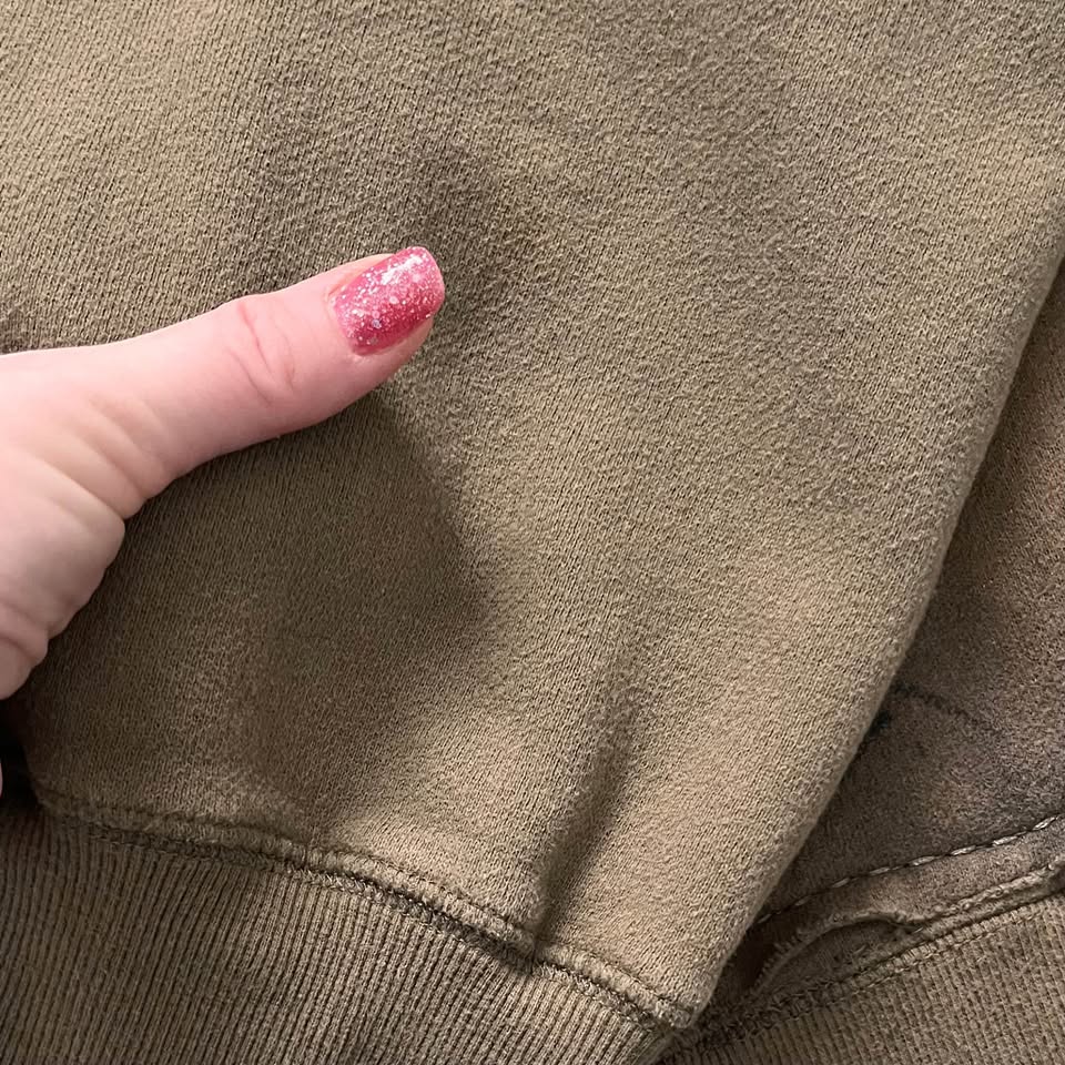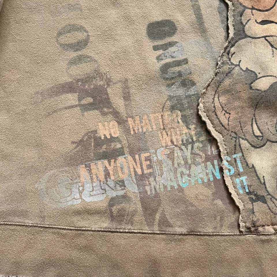 Classic Disney Snow White and The Seven Dwarfs sweatshirt. "No Matter What" written with a large Grumpy cutout stitched on the front. One-of-a-kind sweatshirt with a lived-in, classic crewneck feel. Warm and cozy, and the perfect oversized fit! Good pre-loved condition with slight wash wear and a spot on the sleeve as shown in the photos. The colour is difficult to describe, I would say it's an earthy brownish green.