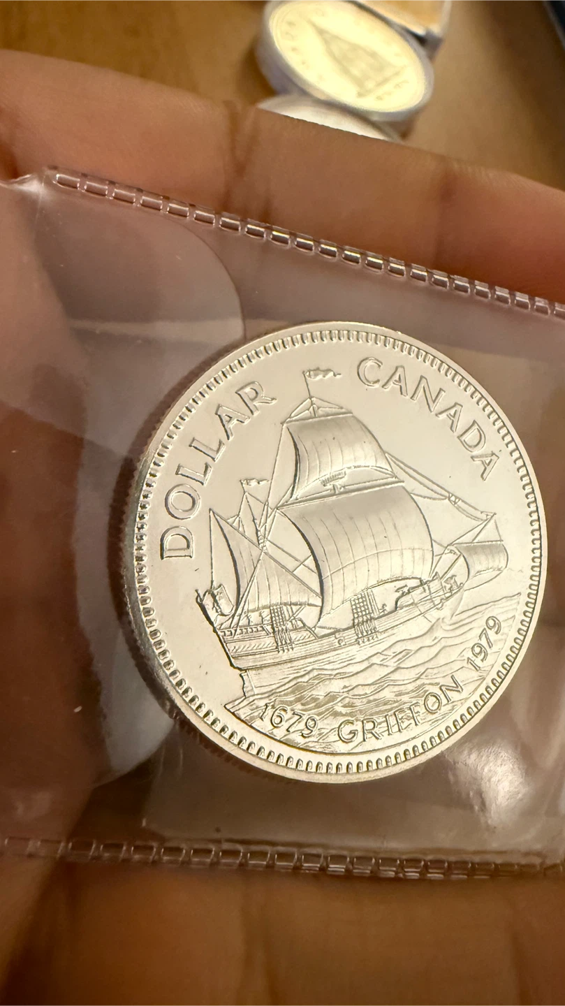 Selling a 1979 Canadian silver dollar coin featuring Elizabeth II on one side and The Griffon ship on the other! It's in great condition and comes in a protective plastic case