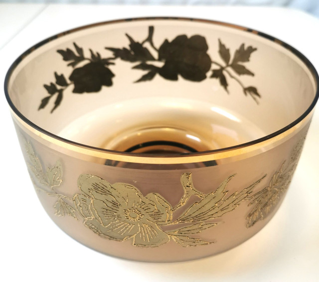 This vintage serving dish features a round shape with a gold gilt band and floral accents on amber glass. It is a decorative piece perfect for serving food or displaying. The elegant design and rich gold color add a touch of sophistication to any table setting. Dimensions- Height 4.75 inches, Diameter 8 inches. NOTE: Good condition regular wear based on age.