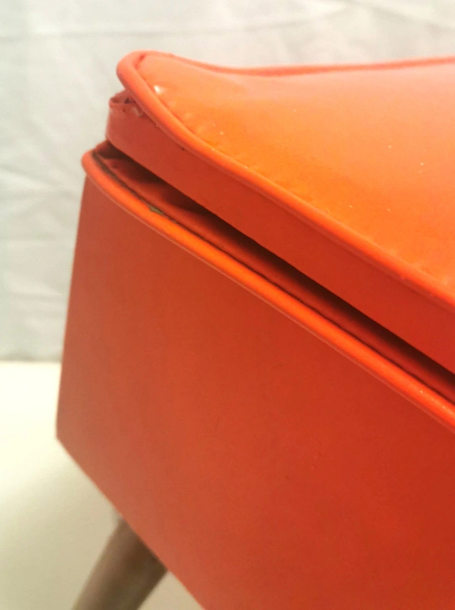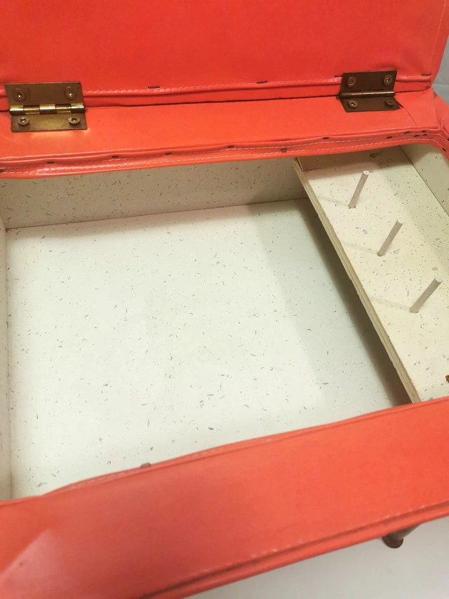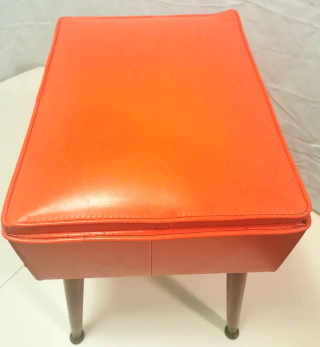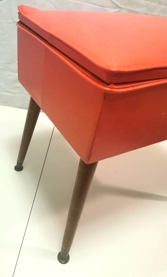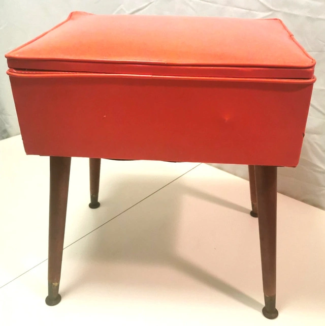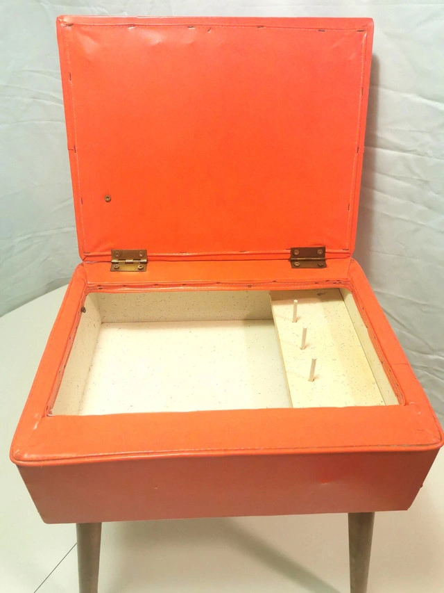 Unique sewing kit from the early 1950s. Opens up for storage inside. Vintage condition, light wear, back left corner fabric lifted, small blemish. Please reference photos as part of the description. Dimensions- Length 13 inches, Width 18.5 inches, Height 18 inches.