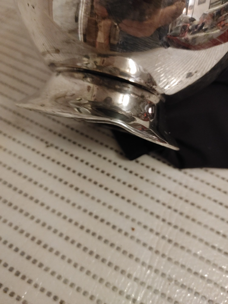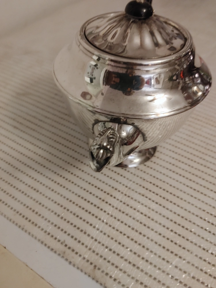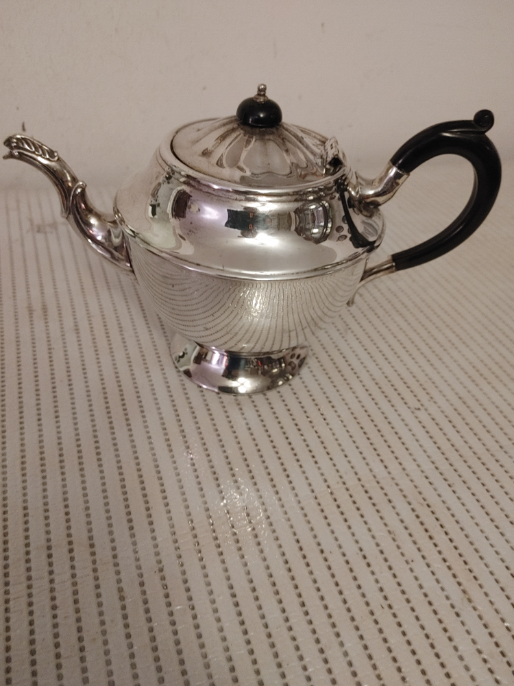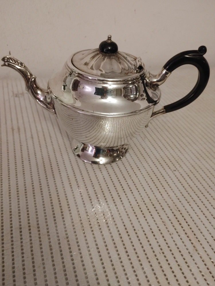 Selling a silver teapot made by Colonel Plate E.G.M. & Co. It has a unique design and is marked with the number 435 on the bottom