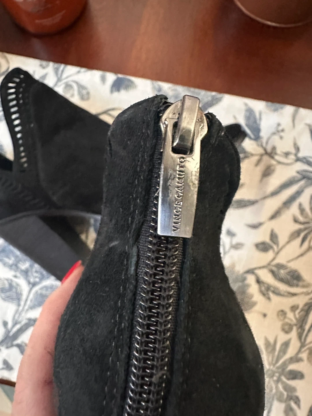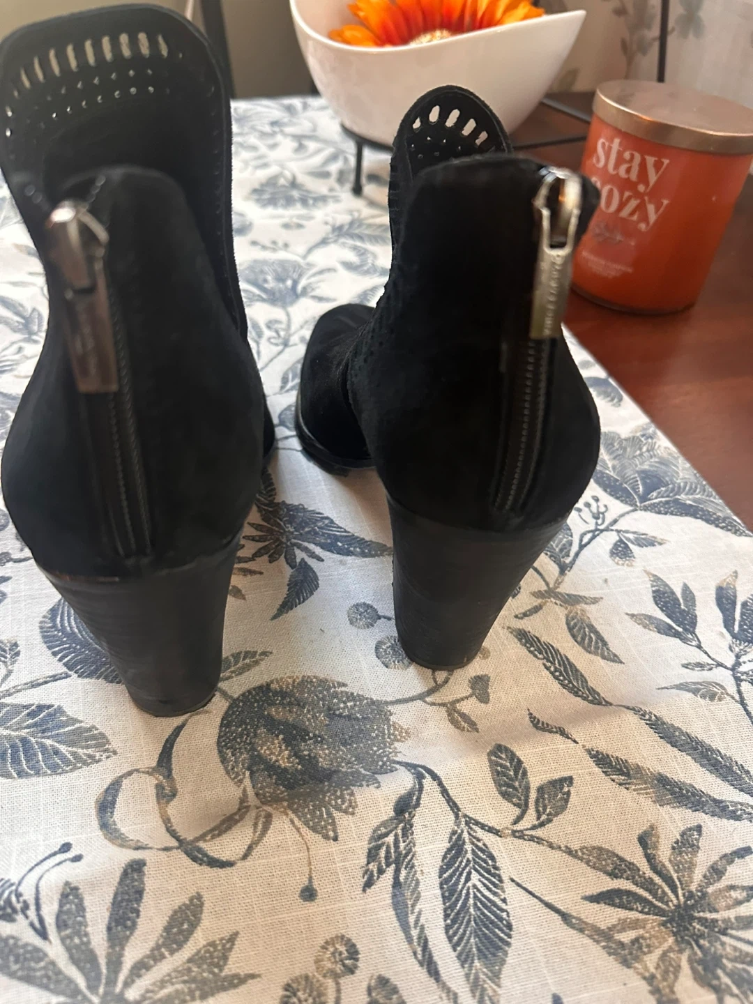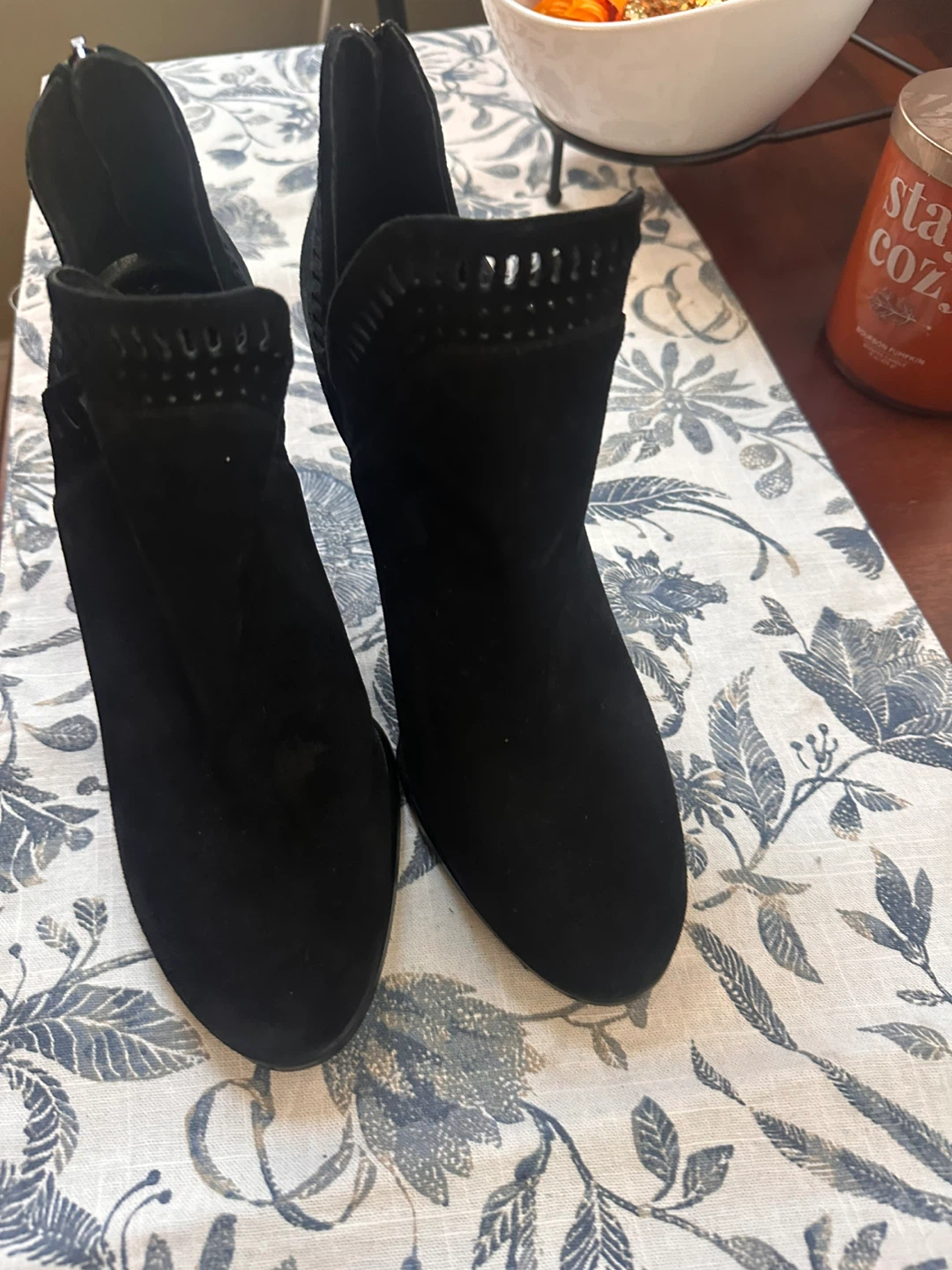 Selling a pair of Vince Camuto black suede booties in size 9.5. They show some signs of wear on the soles but are still in good condition and ready for a new home!