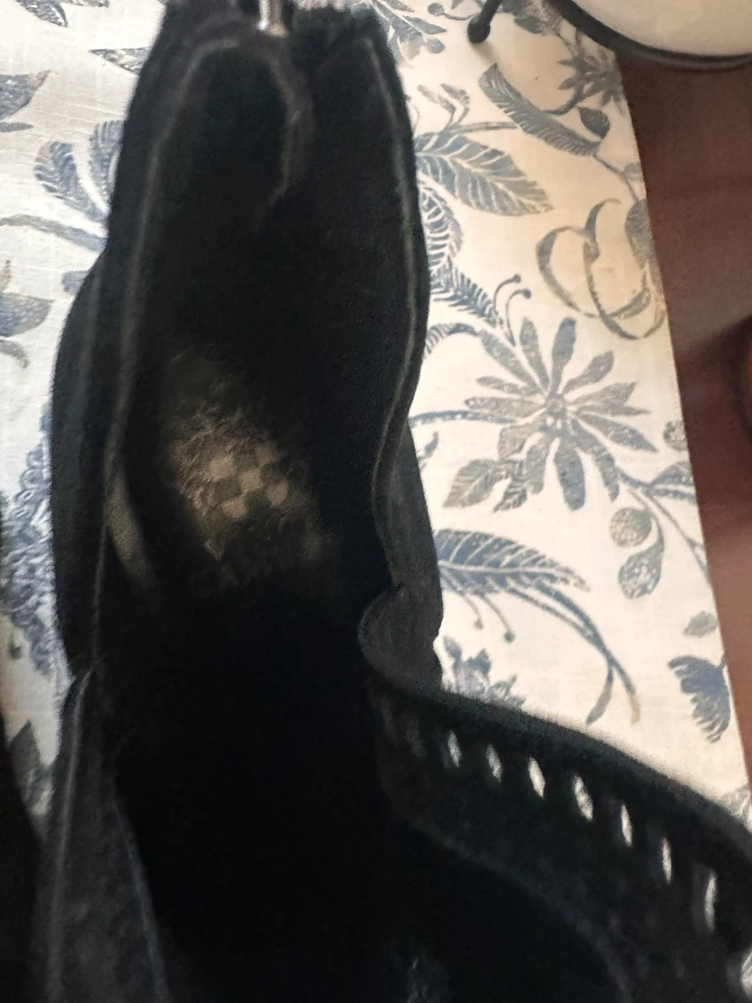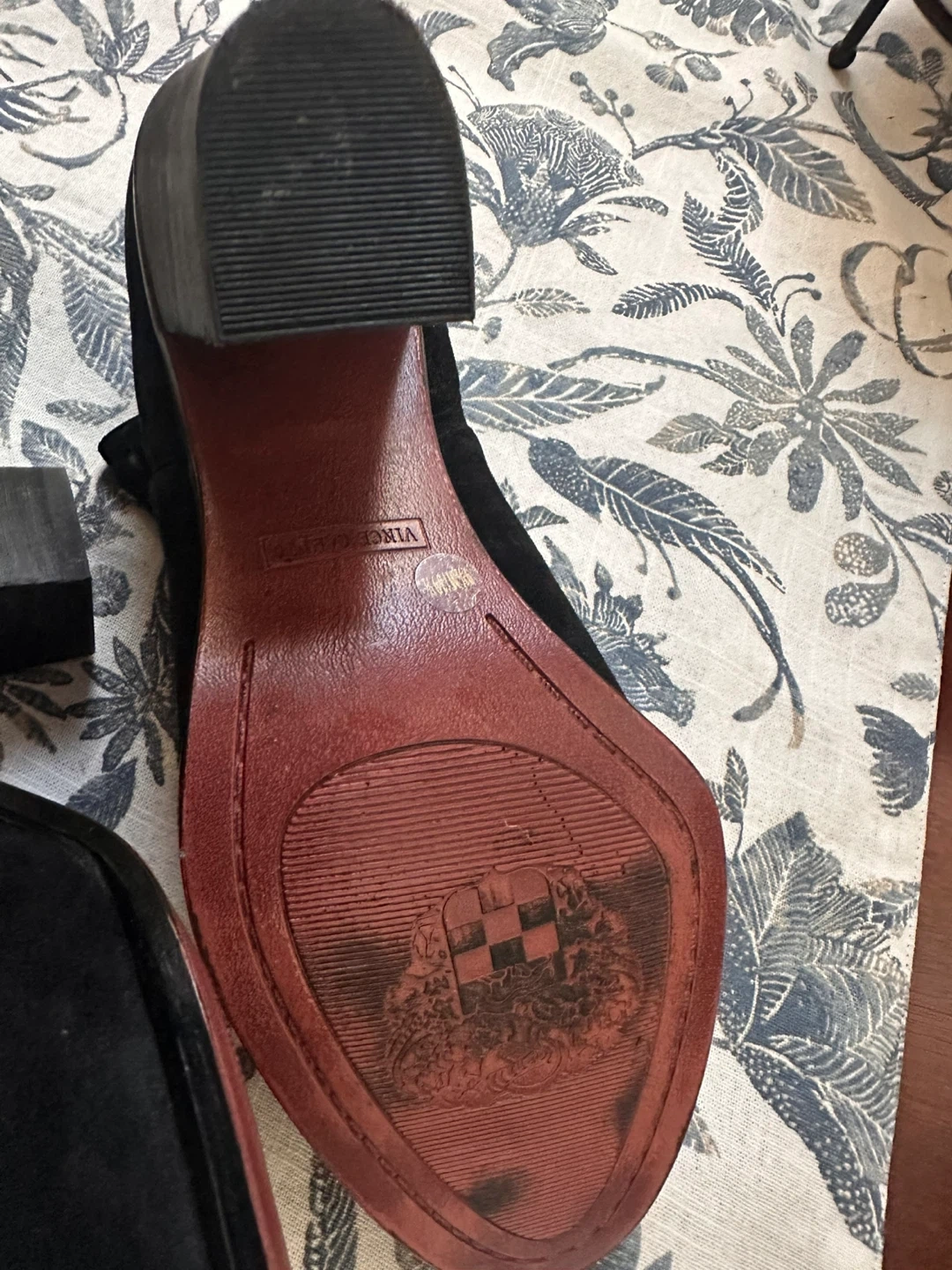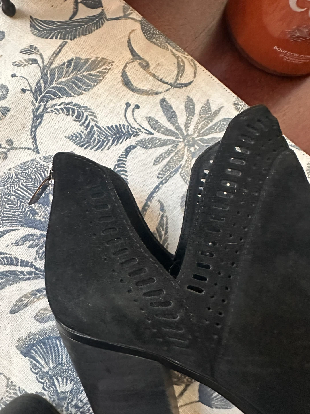 Selling a pair of Vince Camuto black suede booties in size 9.5. They show some signs of wear on the soles but are still in good condition and ready for a new home!