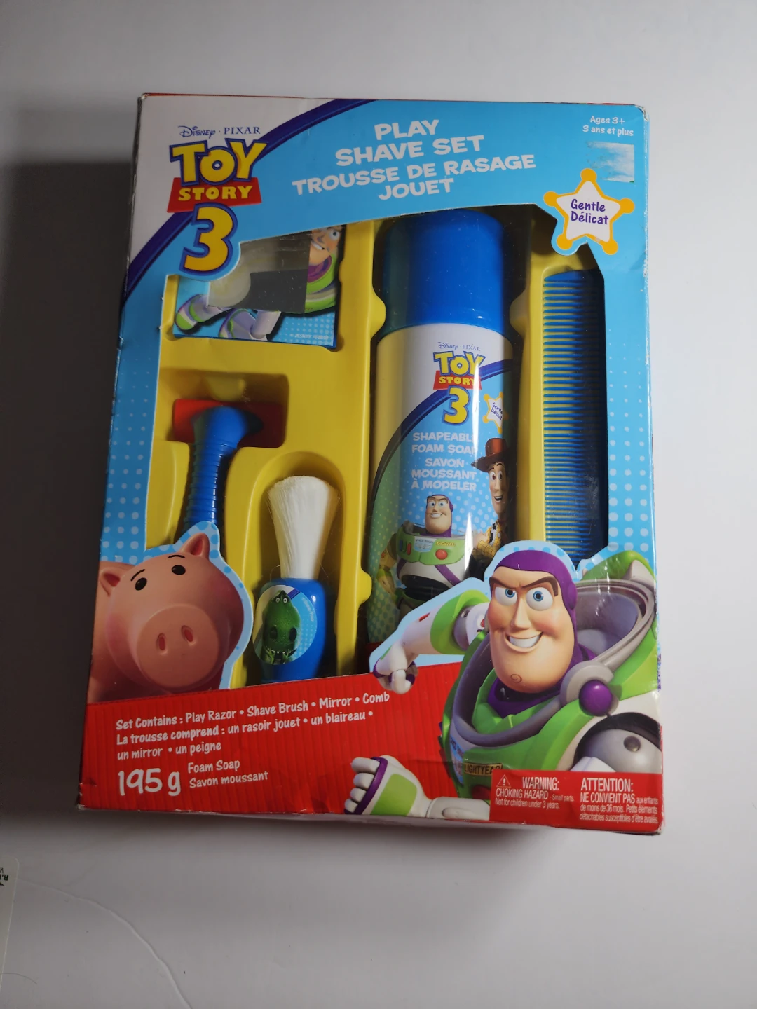 New in box Toy Story 3 Play Shave Set! Includes a play razor, shave brush, mirror, and comb for fun grooming play. Perfect for ages 3+