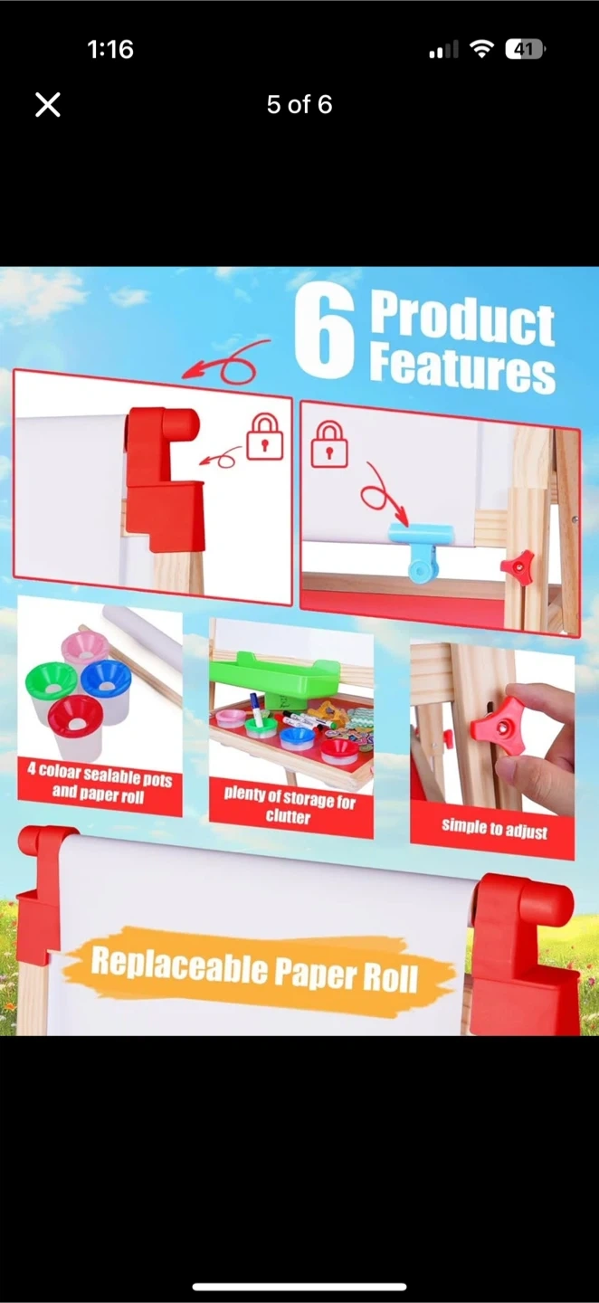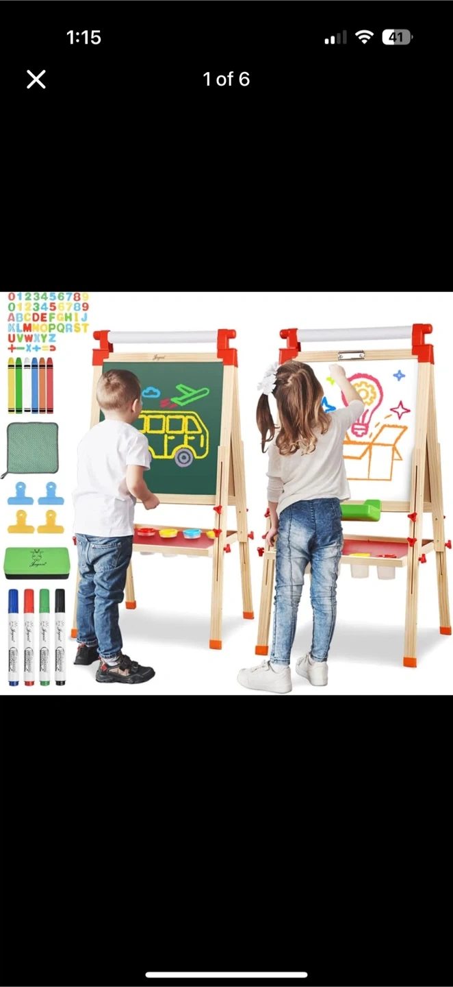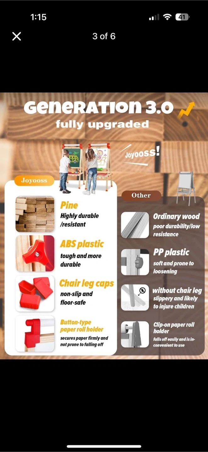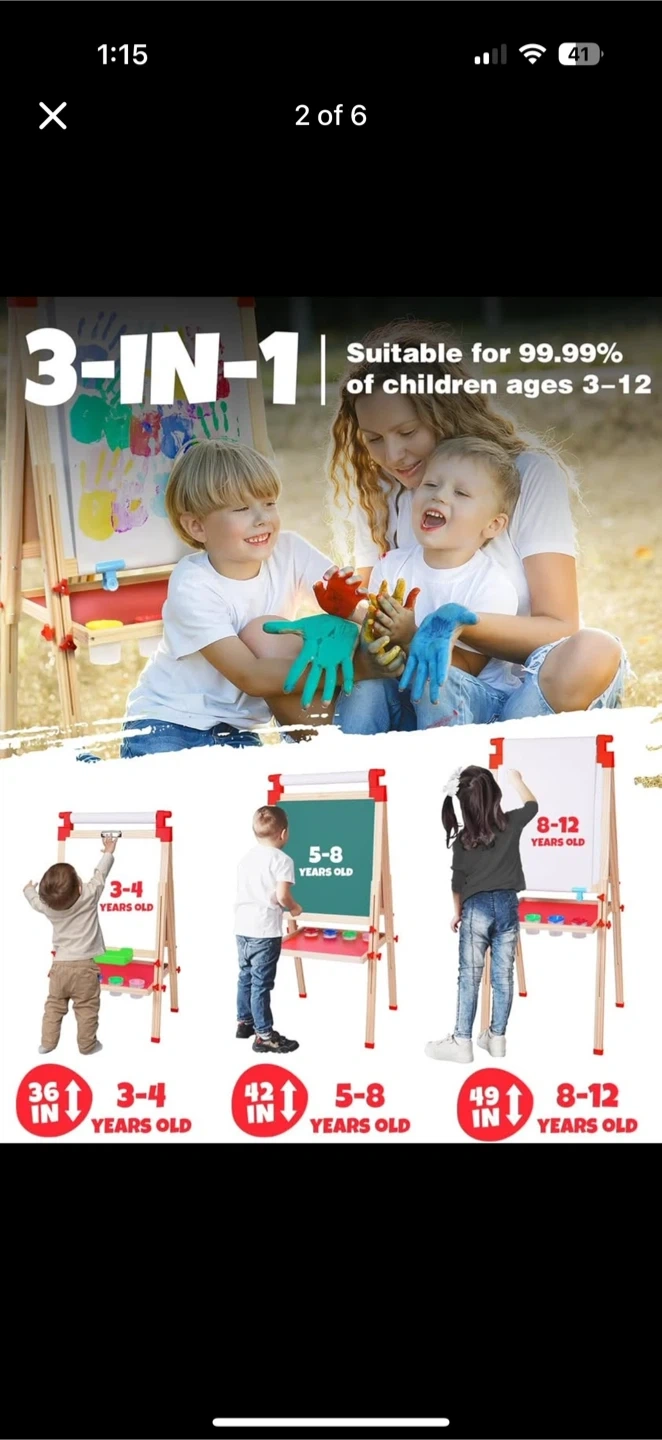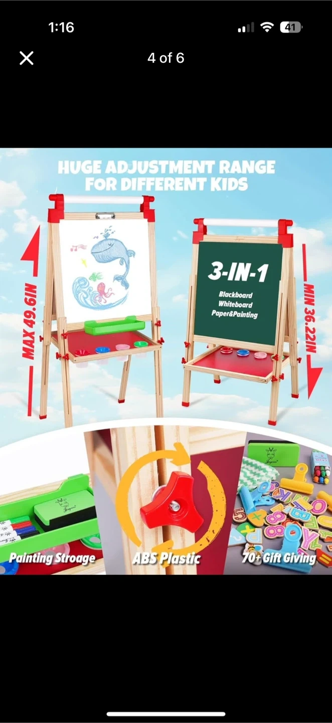 This Joyooss 3-in-1 easel is perfect for kids ages 3-12! It features a blackboard, whiteboard, and paper-painting surface. The easel is adjustable, ranging from 36.22 to 49.6 inches in height. The frame is made of pine, and the accessories are made of ABS and PP plastic. It also includes storage for paint and paper rolls, plus four sealable color pots