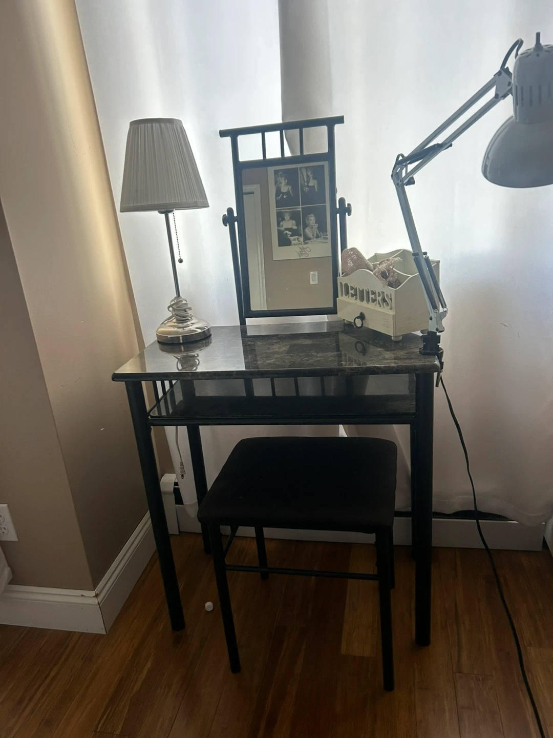 Selling a vanity desk with a mirror and stool. It's in good condition and would be a great addition to any bedroom or dressing area