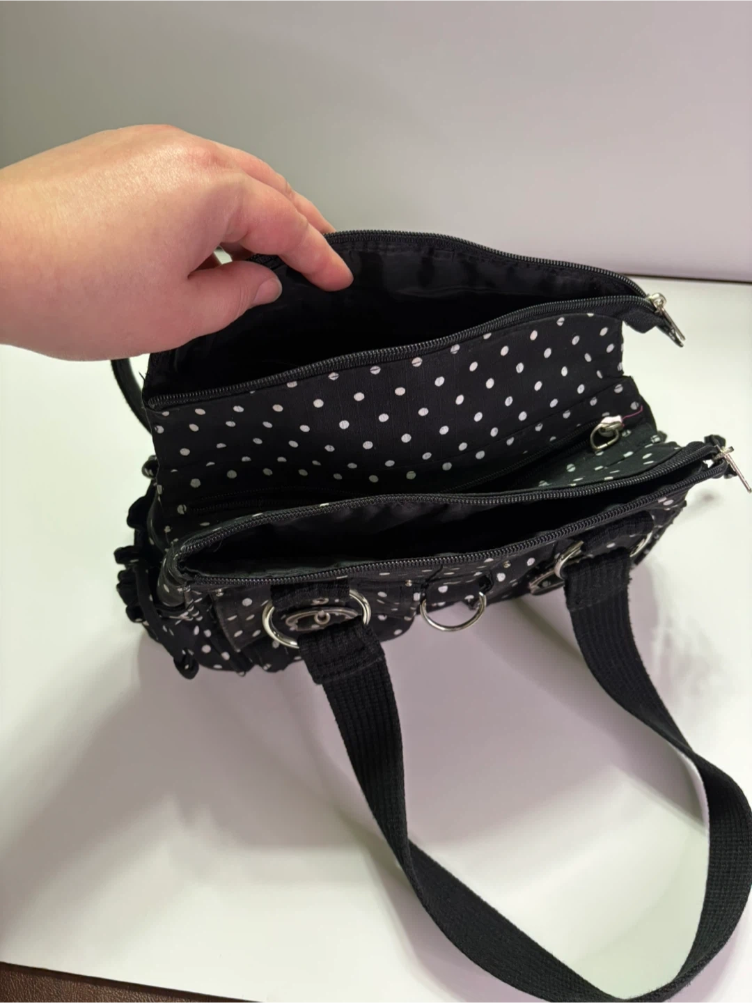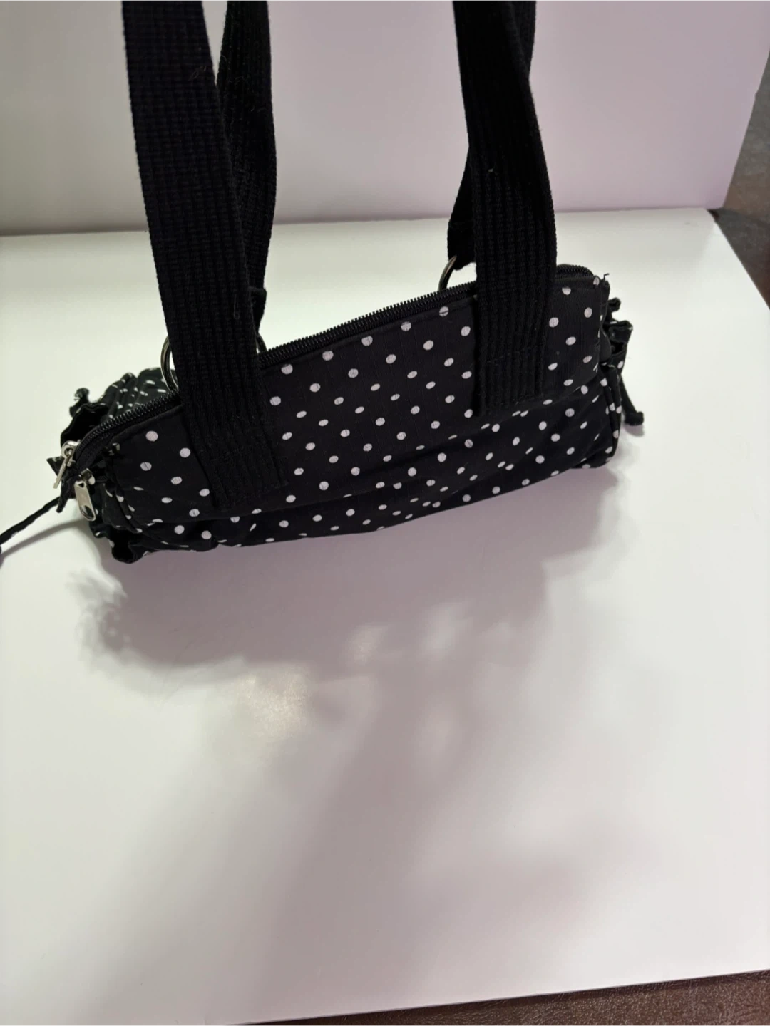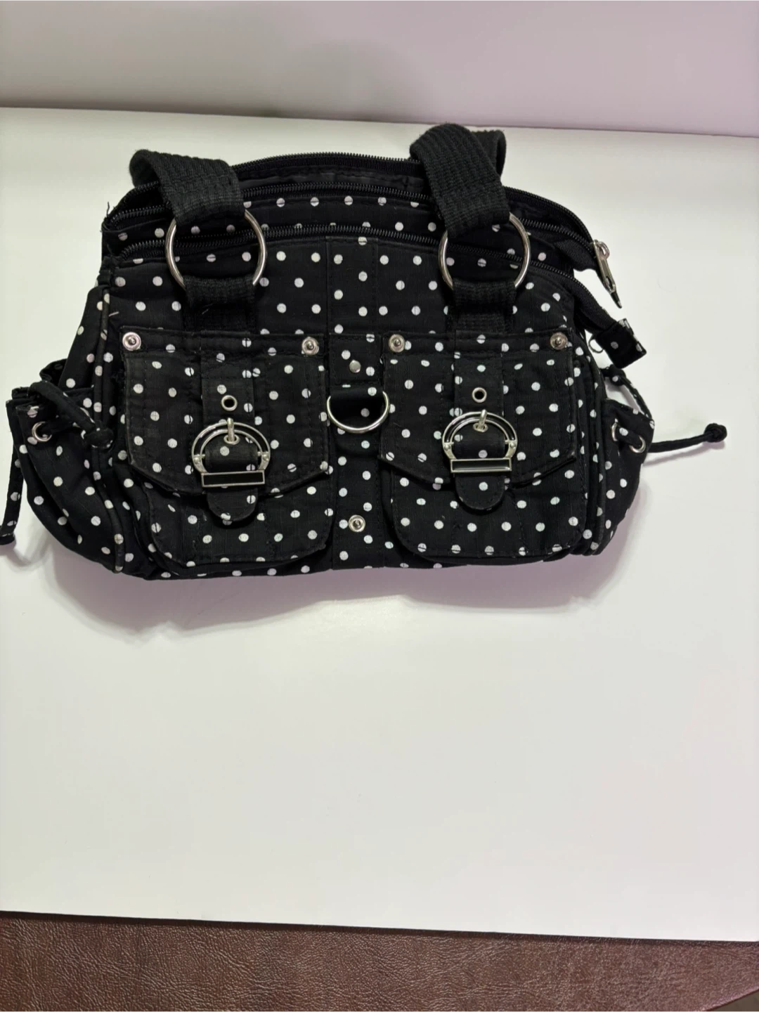Cute polka dot handbag! It's black with white polka dots and has a couple of pockets on the front. The inside has a few compartments to keep things organized. Great for everyday use.