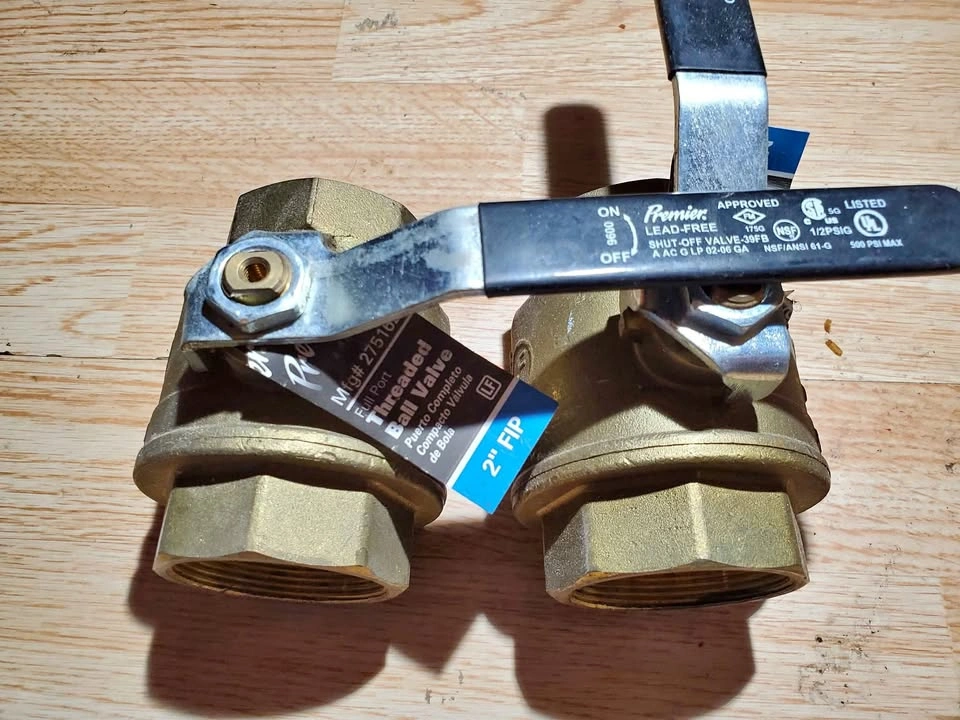 Brand new 2-inch brass ball valves (NPT, full-port). Never installed, still with tags. Quarter-turn shutoff, heavy-duty solid brass. Great for water, irrigation, plumbing manifolds, and shop air (verify ratings). Selling as a pair—can split.