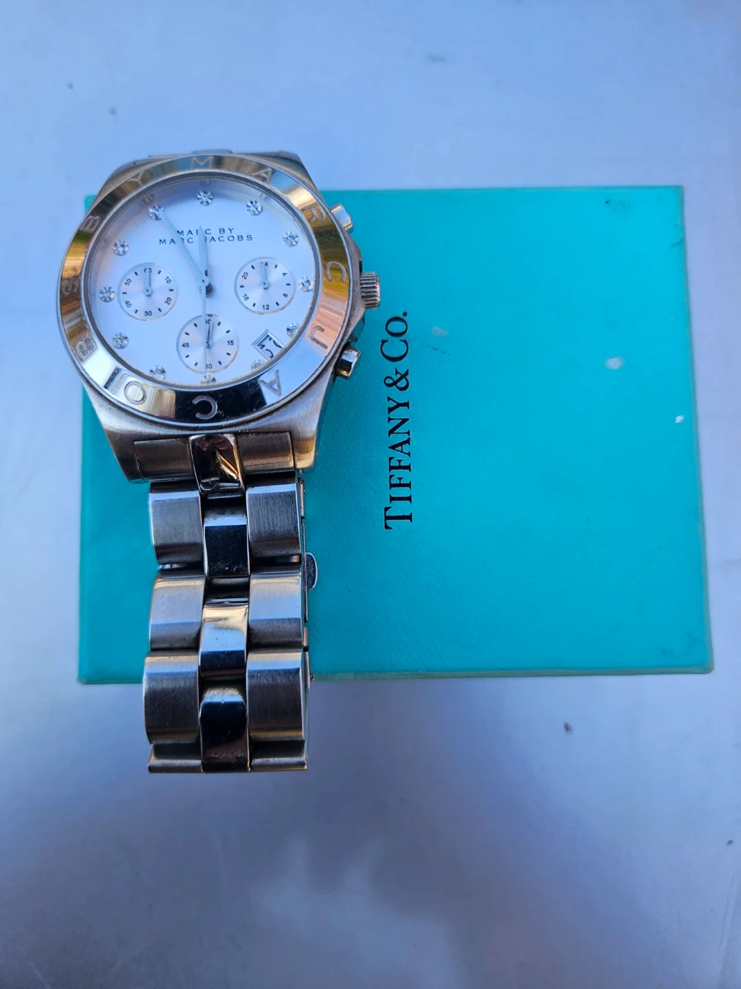 Selling a Marc by Marc Jacobs women's watch with a silver-tone band and a white face. The watch has a chronograph display and is accented with crystal details. It comes with the original Tiffany & Co. box.