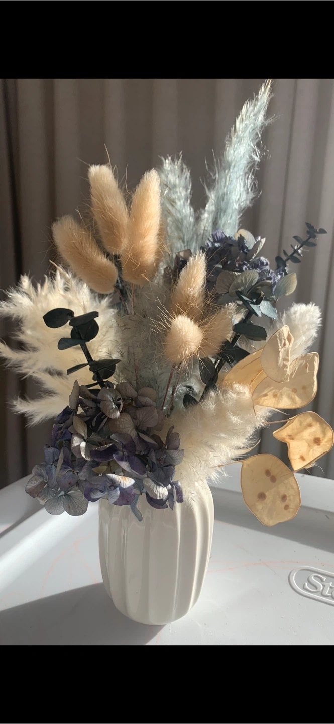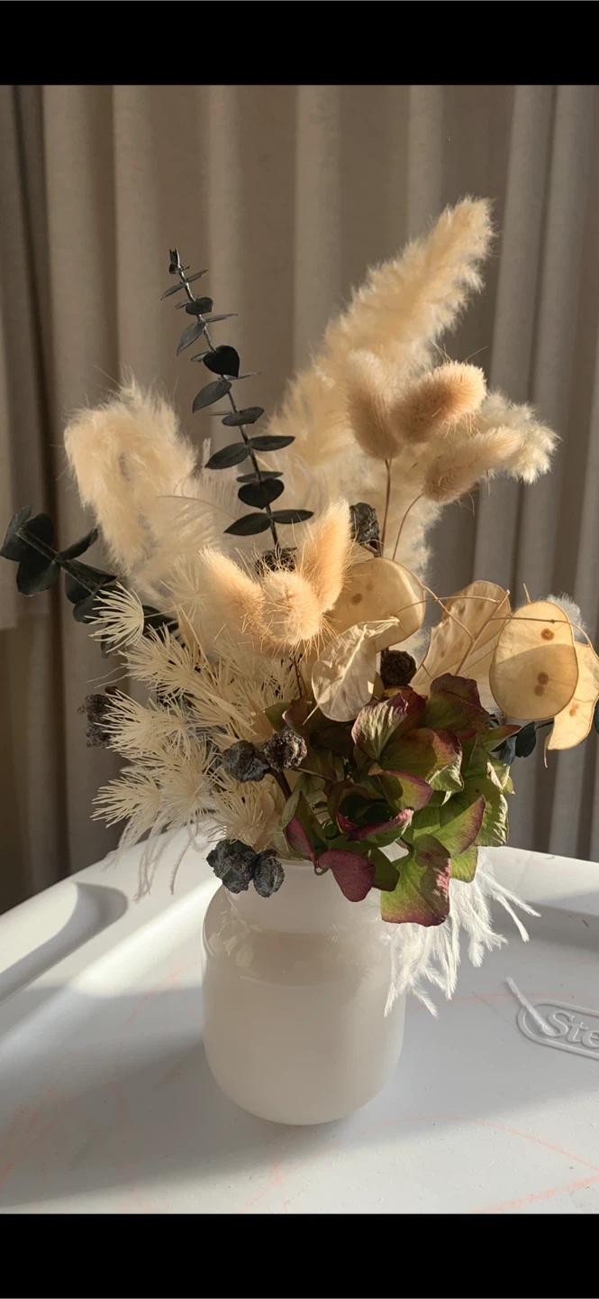 A lovely dried flower arrangement in a small, white vase. It's perfect for adding a touch of natural beauty to any room! The arrangement features a variety of dried flowers in neutral and muted tones.