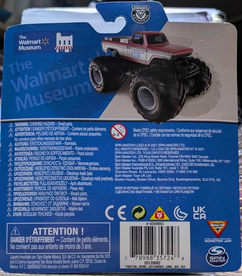 The Walmart Museum is a 1:64 scale truck produced by Spin Master for the Monster Jam die-cast line. It was originally planned to be released in 2022 exclusively in Walmart stores, to promote the Walmart Museum. The casting is modeled after Walmart founder Sam Walton's 1979 Ford F-150. It has the same paint scheme as the real life truck and Walmart Museum decals on its doors. This is the only time as of 2023 that Spin Master has produced a fully accurate Ford F-150 licensed casting.