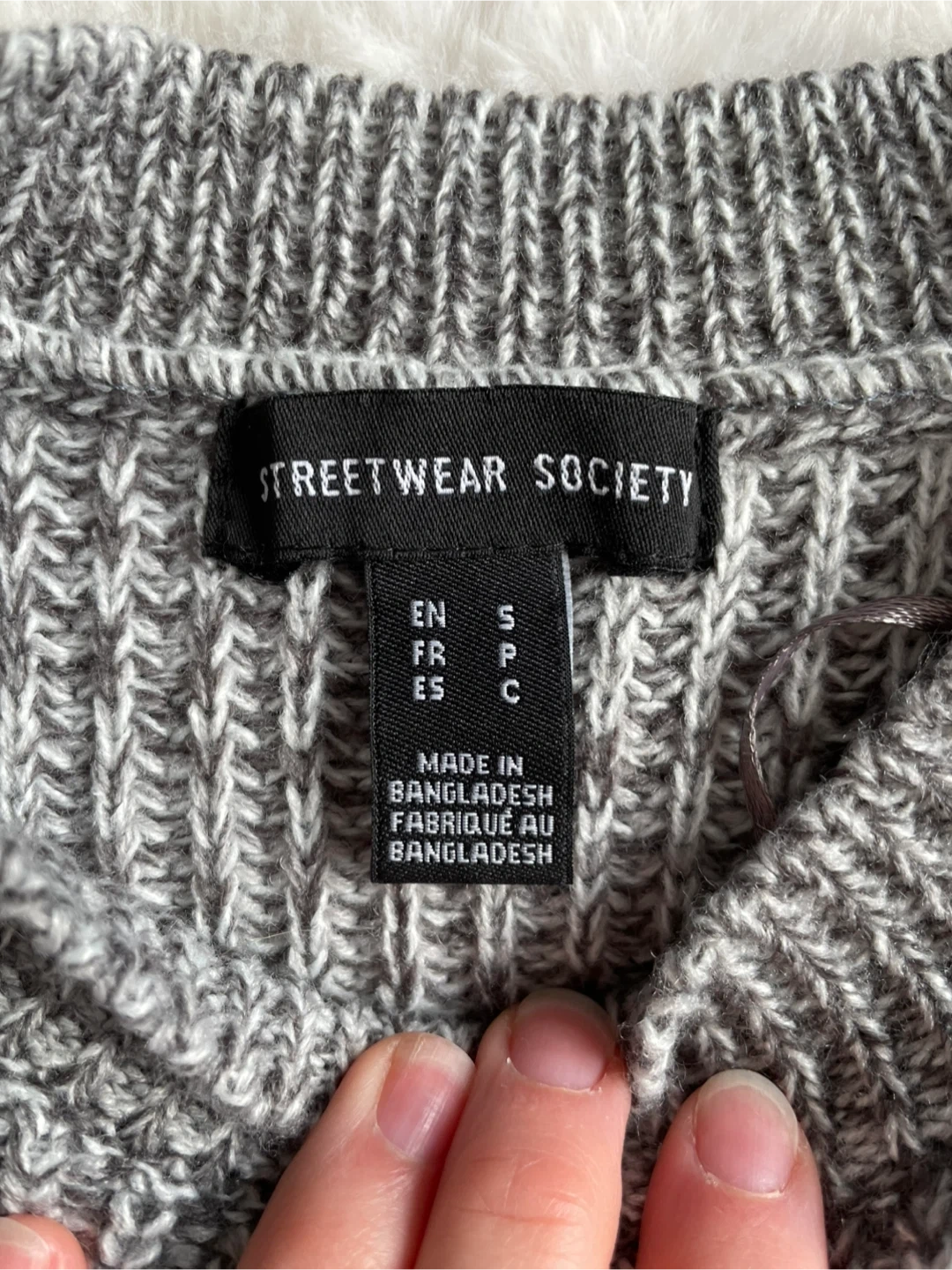 Cozy up in this Streetwear Society knit sweater! It's a lovely grey colour and in a size small. Perfect for those cooler days!