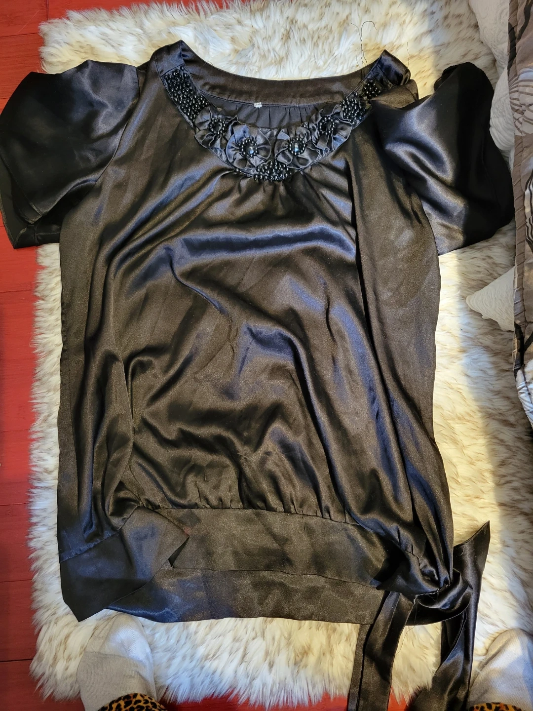 This is a lovely black satin blouse, featuring a unique beaded neckline. It has short sleeves and a tie detail on the side. Perfect for dressing up or down!