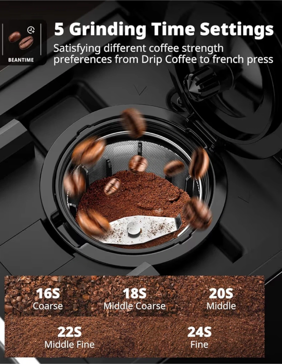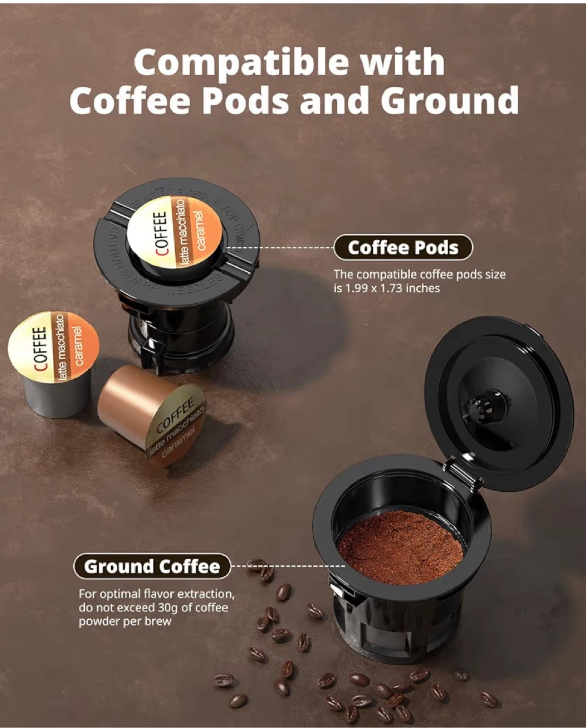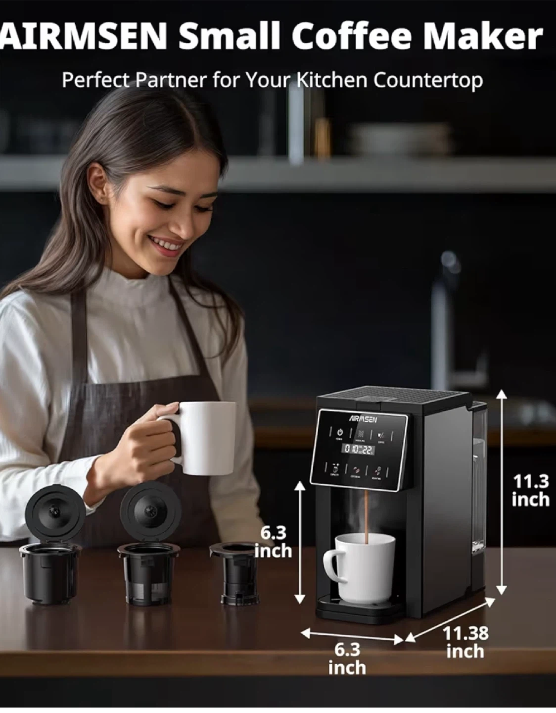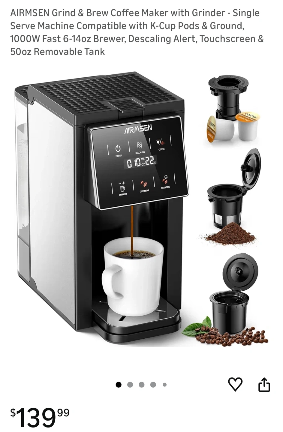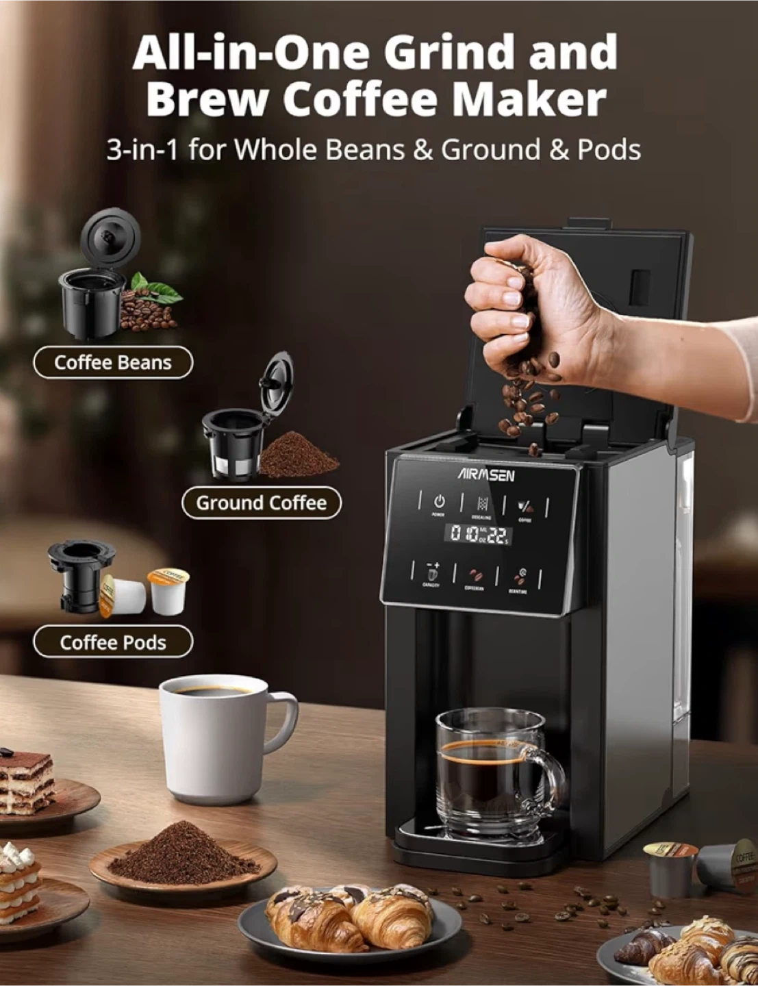 AIRMSEN Grind & Brew Coffee Maker with Grinder! It's a single-serve machine compatible with K-Cup pods and ground coffee. It features a 1000W fast brewer, descaling alert, touchscreen, and a 50oz removable tank. It also has 5 grinding time settings to satisfy strength preferences from drip coffee to french press. Perfect partner for your kitchen countertop!