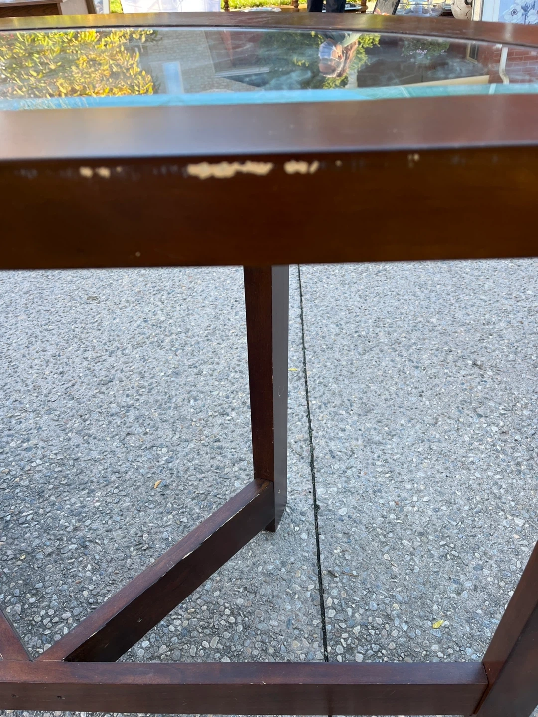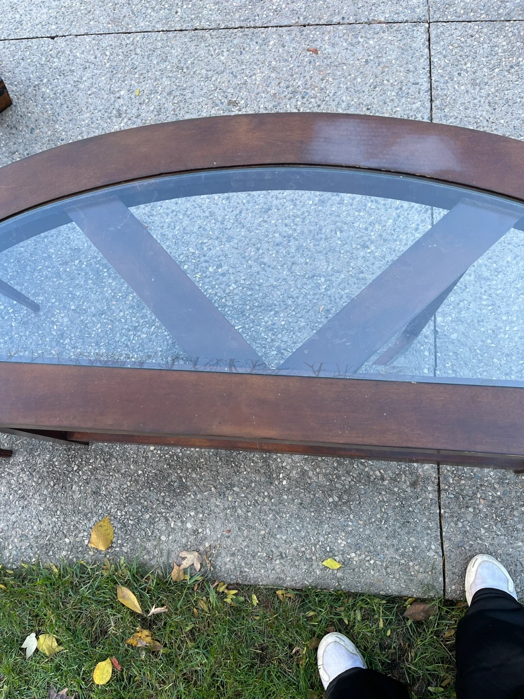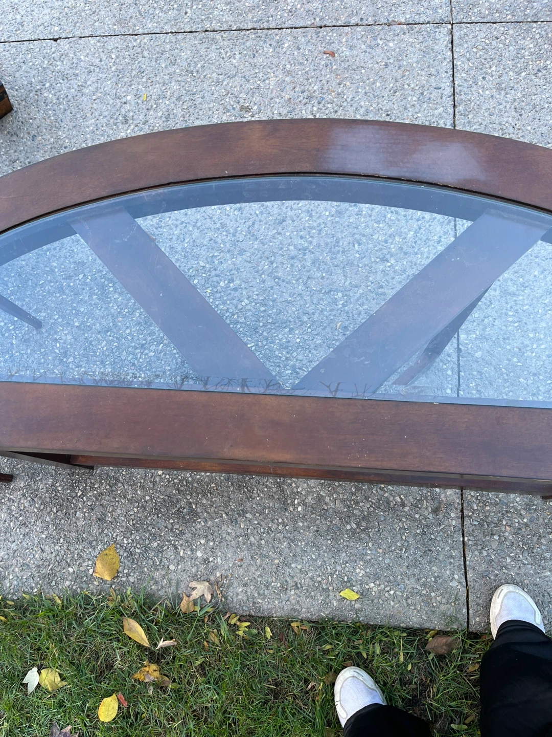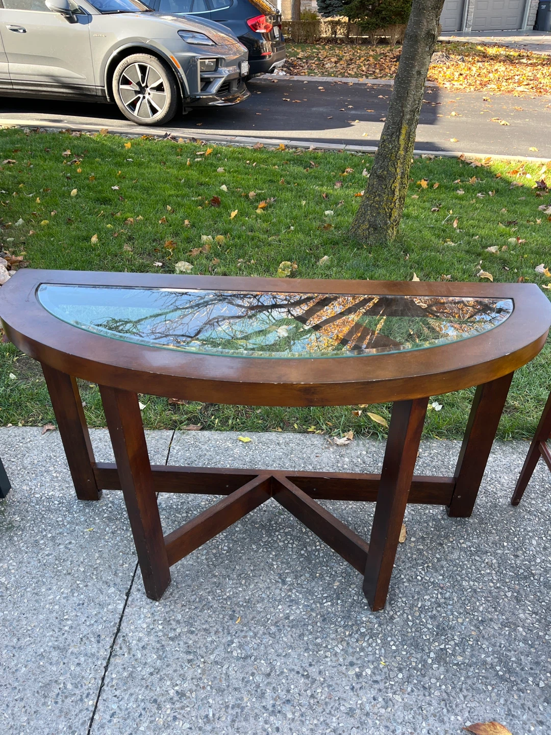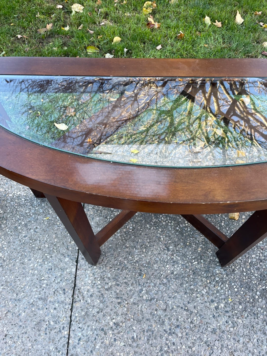 Selling a beautiful half-moon shaped entry table. It features a wood frame and a glass top. There are some signs of wear and tear on the wood. Perfect for an entryway or hallway!