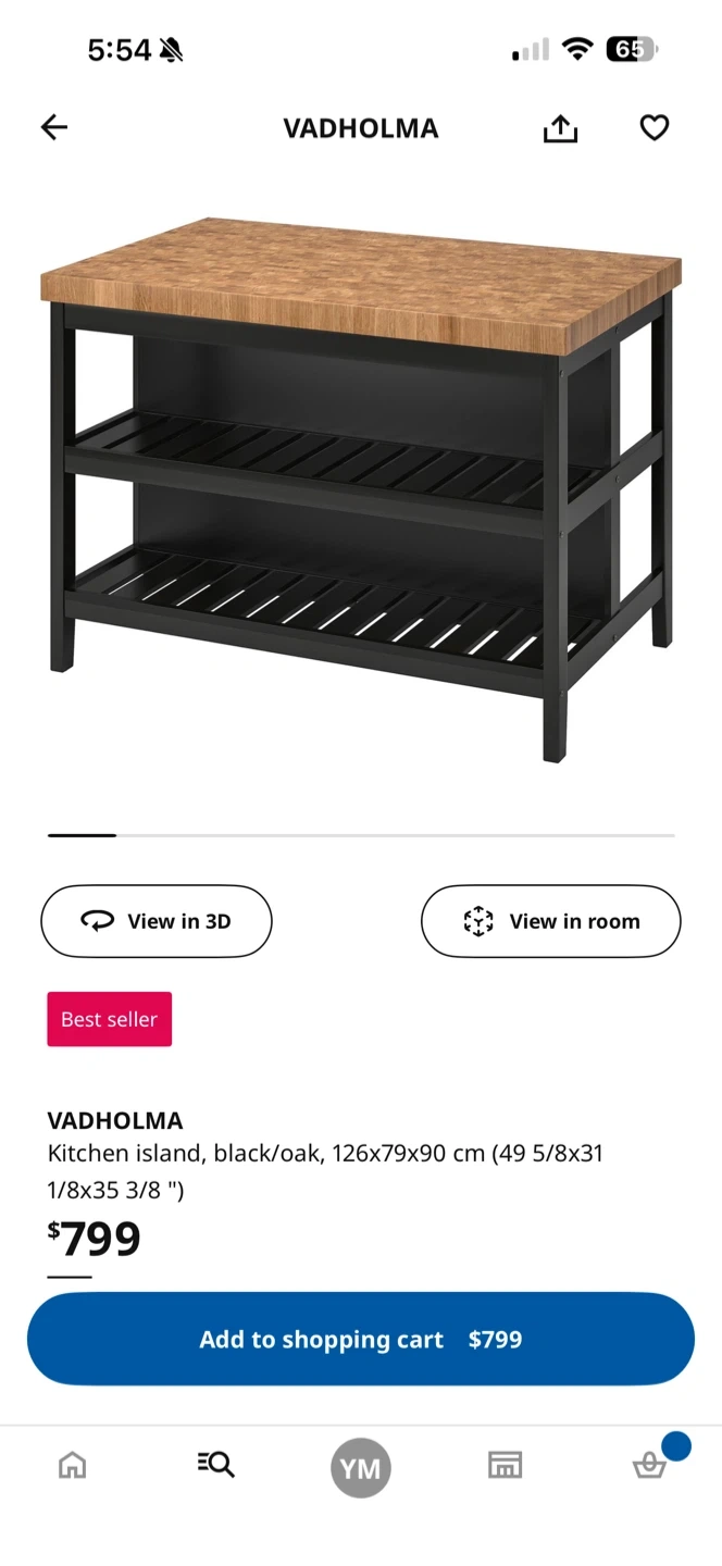 Selling an IKEA VADHOLMA kitchen island in black and oak. It's a great piece for adding extra counter space and storage to your kitchen. The dimensions are 126x79x90 cm (49 5/8x31 1/8x35 3/8 "). I bought this for $799