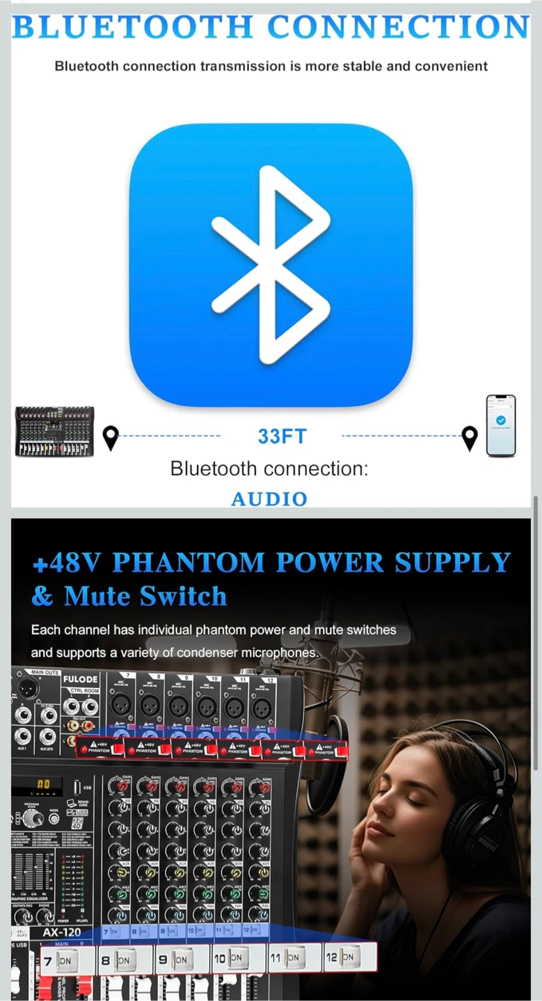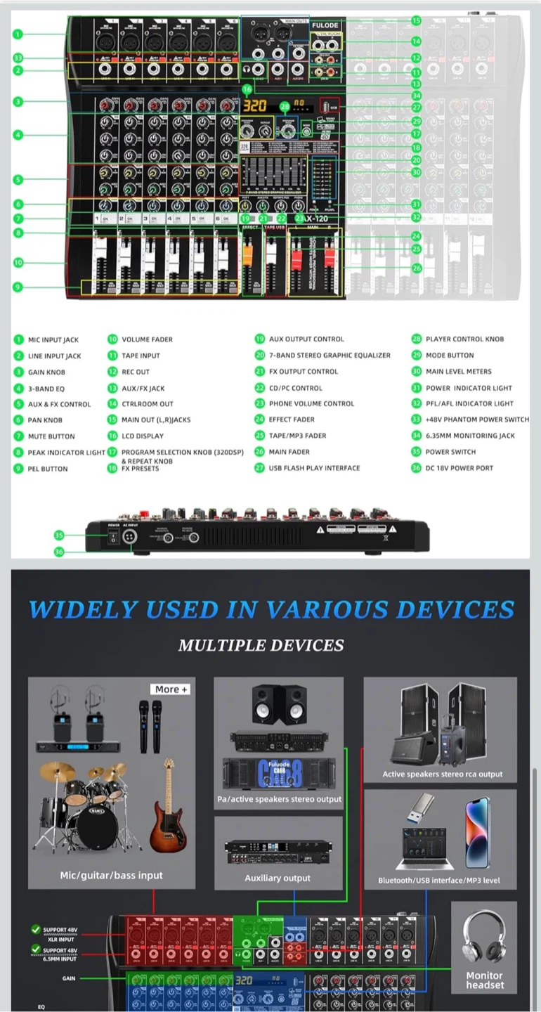 Selling a FULODE AX-120 audio mixer! It features 320 DSP effects and a 7-band EQ for sound mixing. It's compatible with USB and MP3, so you can connect external USB devices, computers, or flash drives for mixing and recording. It also supports a +48V phantom power supply and mute switch