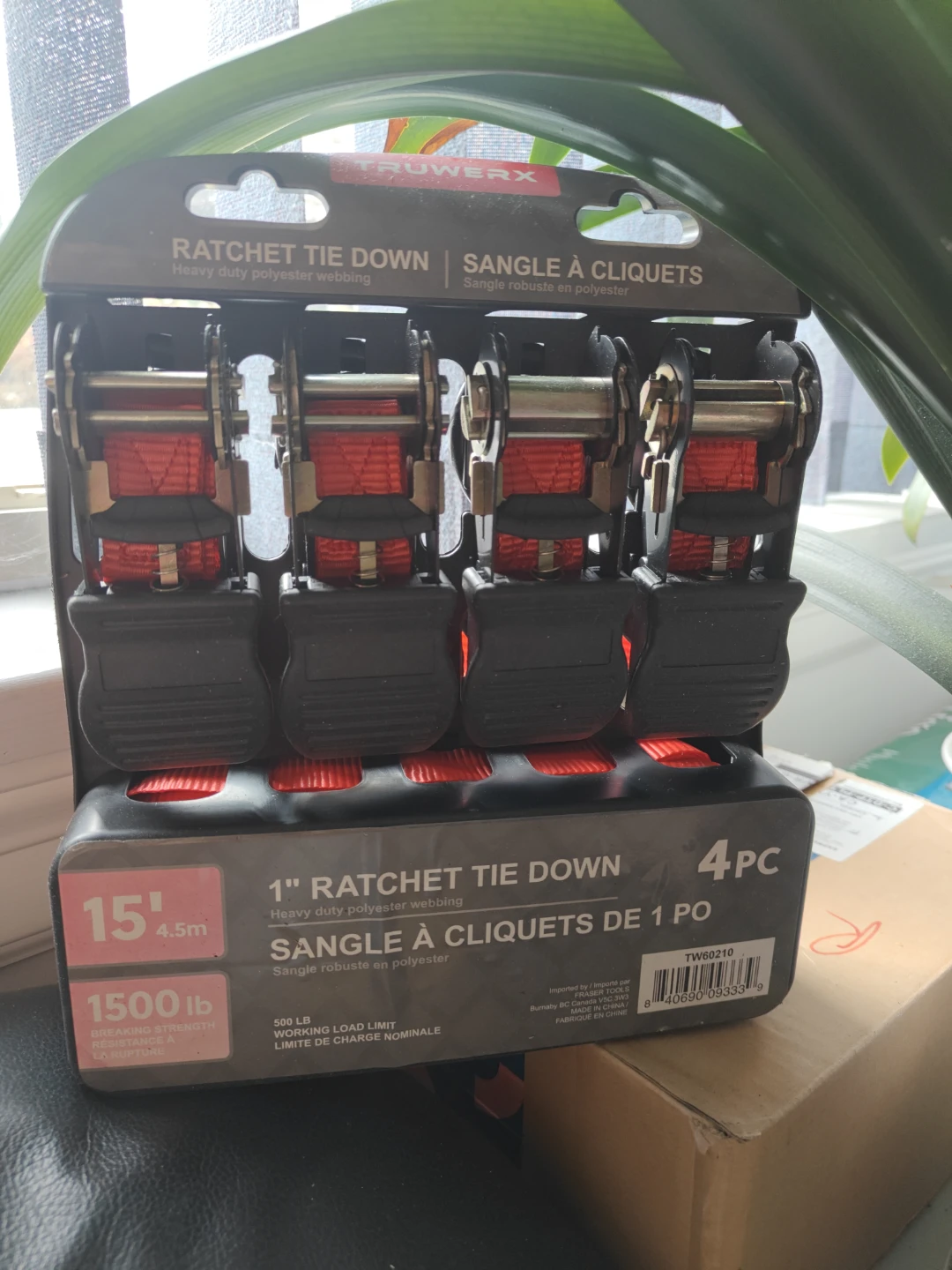 Selling a set of Truwerx ratchet tie downs. This is a 4-pack of heavy-duty polyester webbing straps, each measuring 1 inch wide and 15 feet long. They're capable of handling a working load limit of 500 lbs and a breaking strength of 1500 lbs. Great for securing cargo!