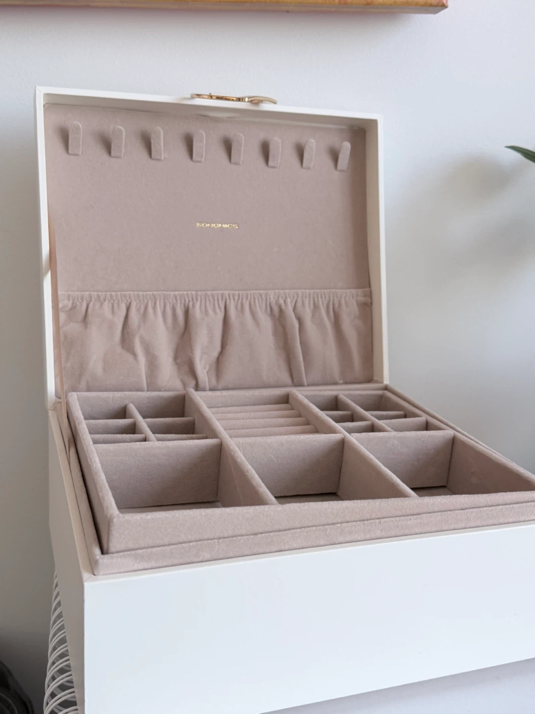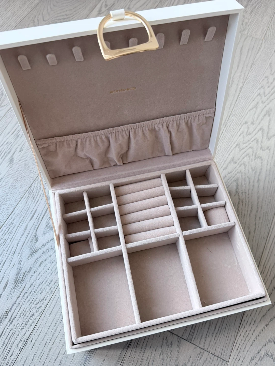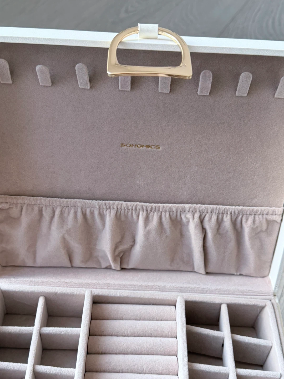 Selling a beautiful SONGMICS jewelry box in white! It's perfect for keeping all your precious pieces organized and safe. The interior is lined with a soft, velvety material to prevent scratches and damage. It has multiple compartments to store rings, necklaces, earrings, and bracelets. It’s in great condition and ready for a new home!