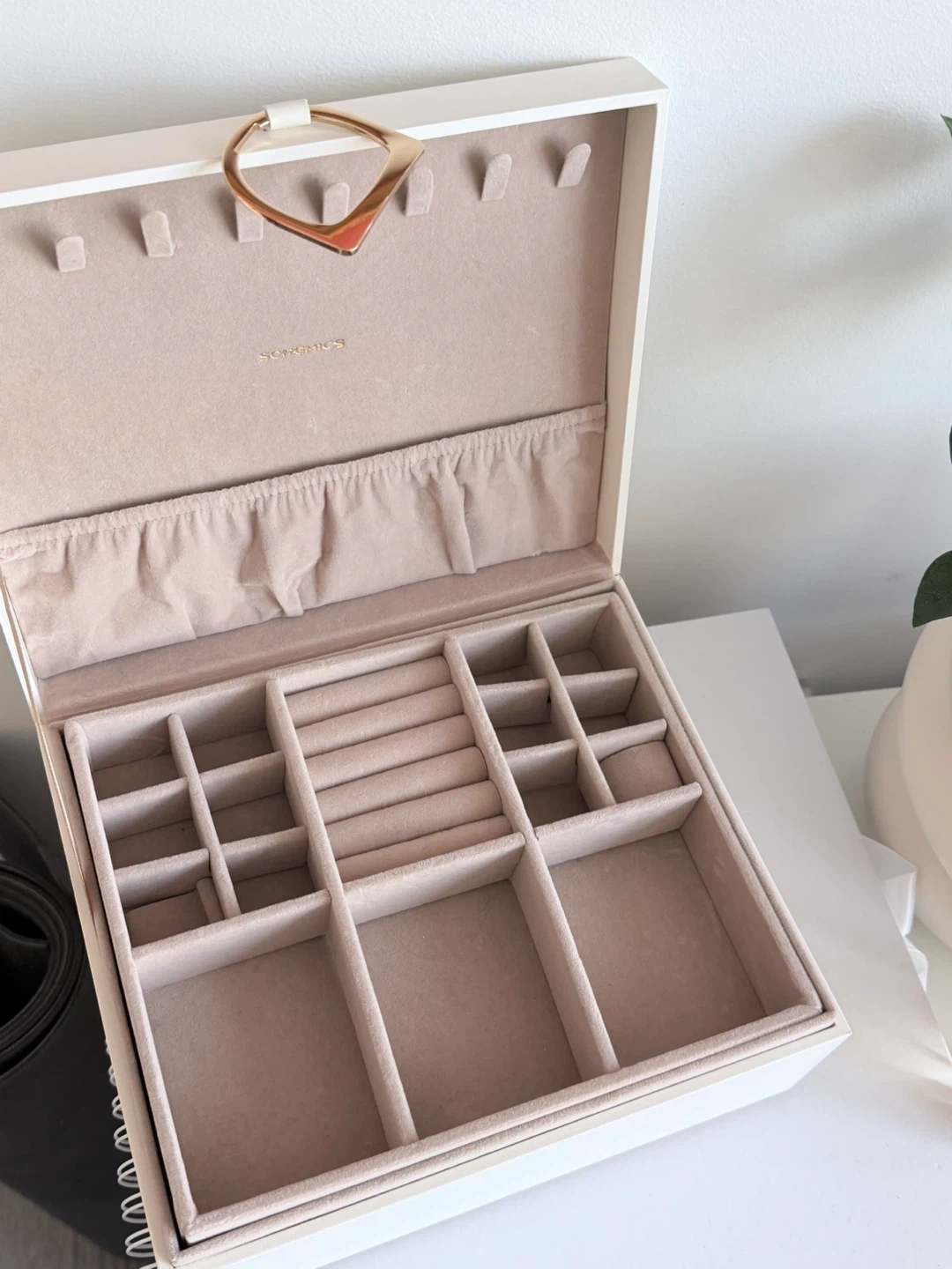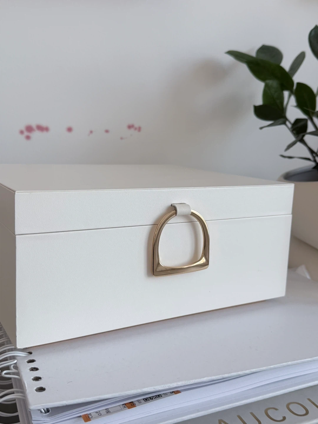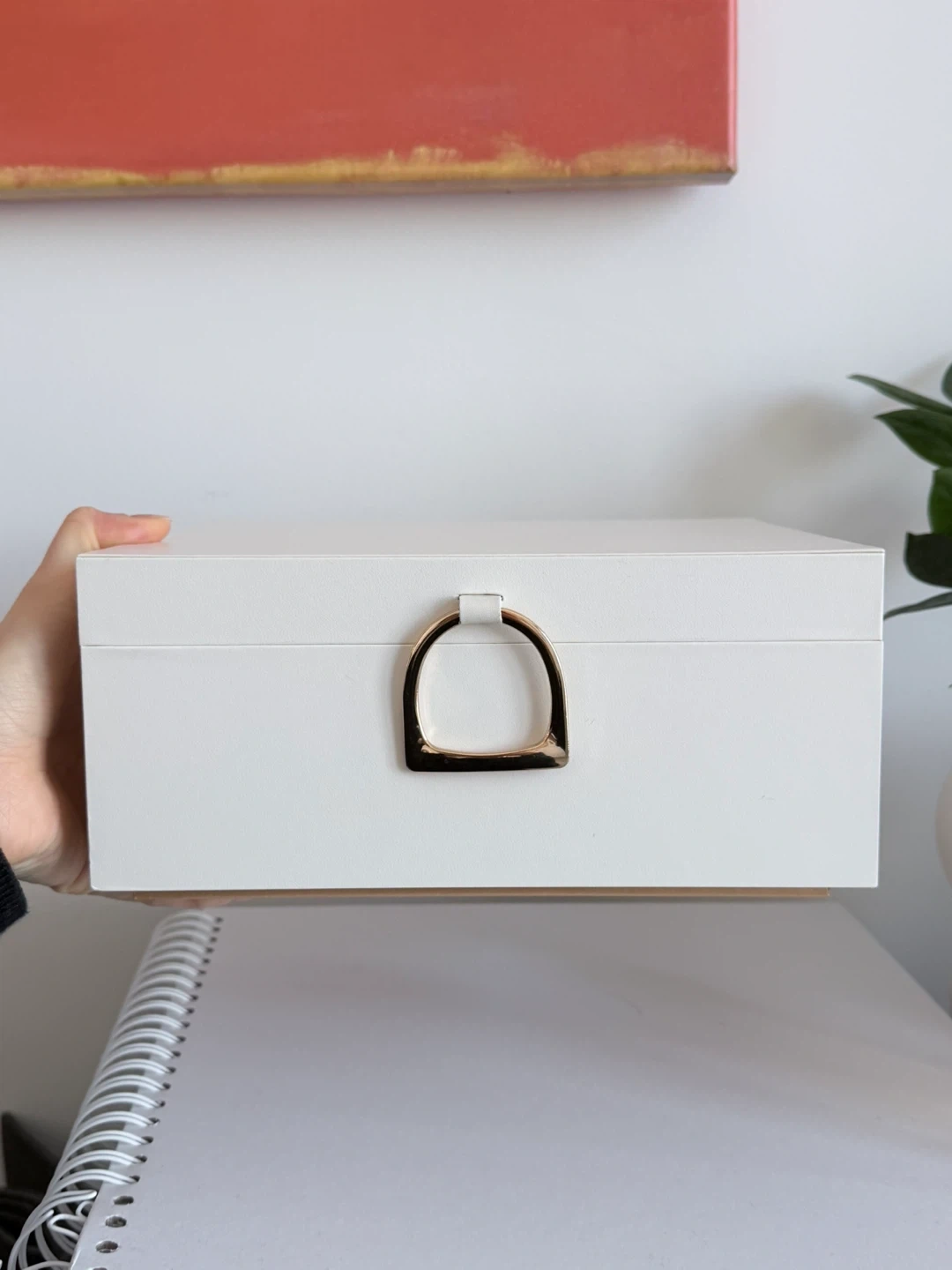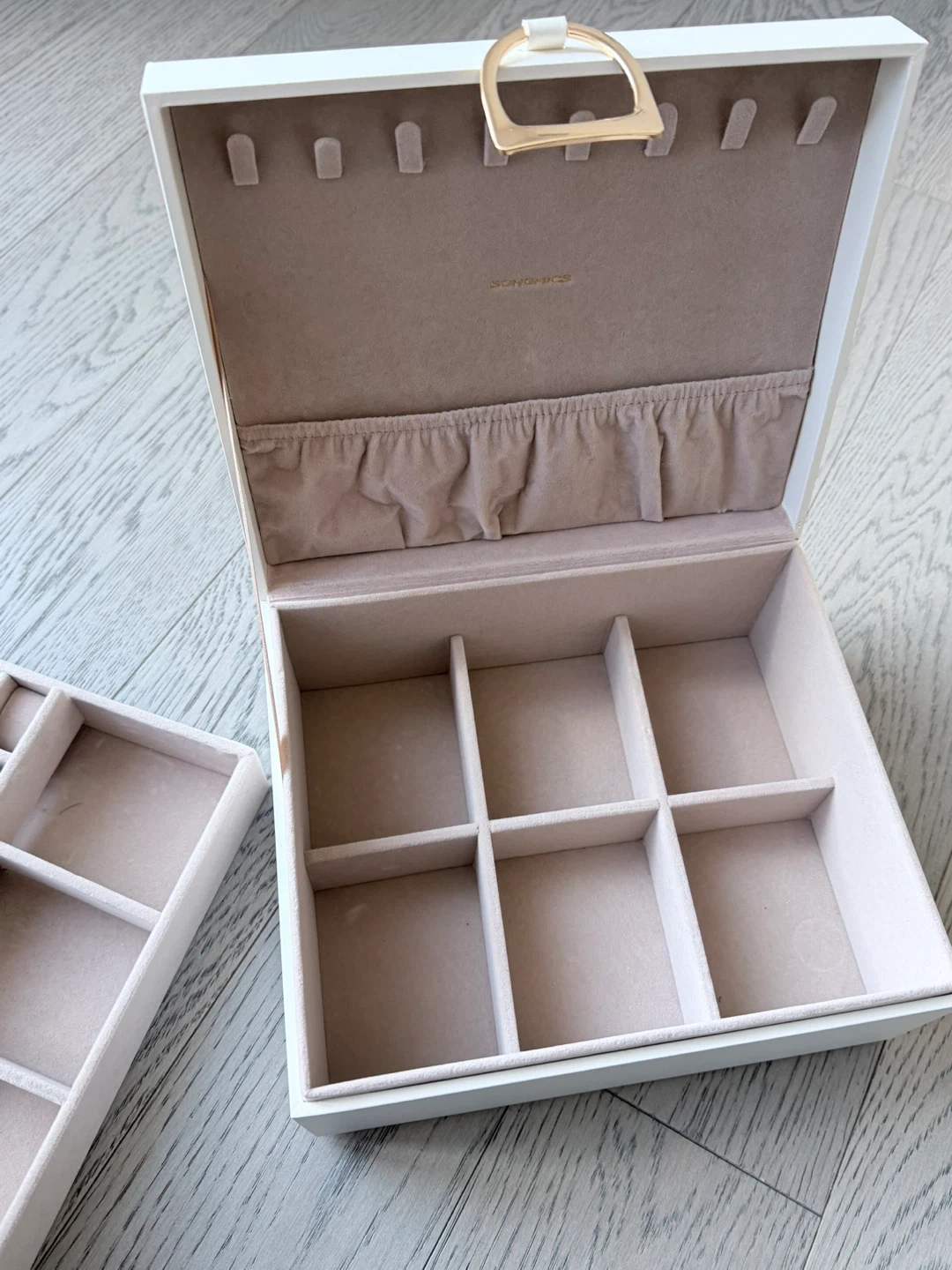 Selling a beautiful SONGMICS jewelry box in white! It's perfect for keeping all your precious pieces organized and safe. The interior is lined with a soft, velvety material to prevent scratches and damage. It has multiple compartments to store rings, necklaces, earrings, and bracelets. It’s in great condition and ready for a new home!
