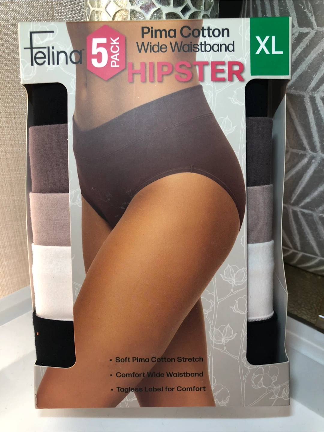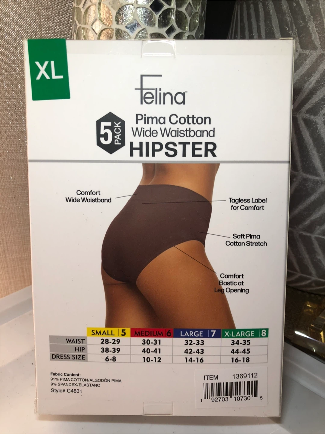 I'm selling a new pack of Felina Pima Cotton Hipster underwear. This is a pack of 5 in size XL. They feature a comfort wide waistband and a tagless label for comfort. The fabric content is 95% Pima Cotton and 5% Spandex.