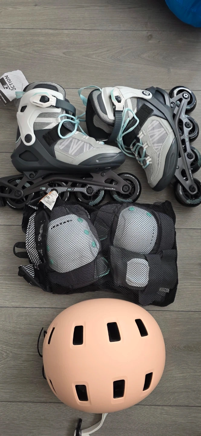Selling a pair of Decathlon Oxelo inline skates in size 39. They come with a matching helmet and a set of protective gear including knee pads, elbow pads, and wrist guards. Great for anyone looking to get into rollerblading!